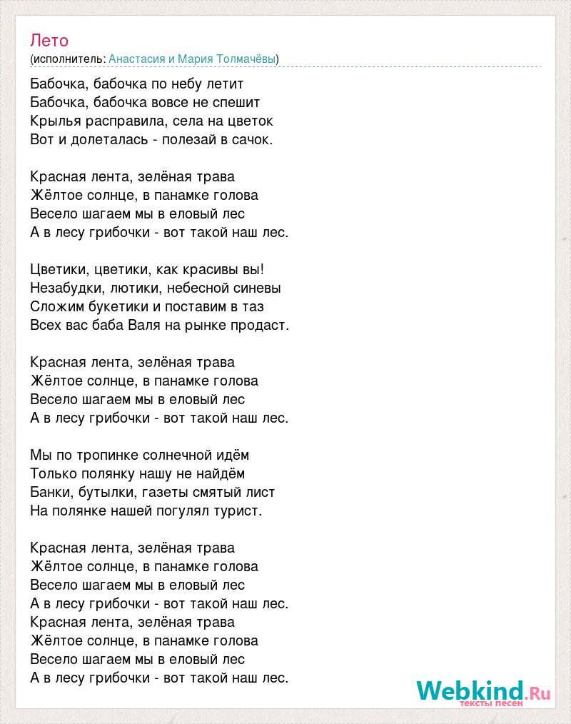 Бабочка, бабочка по небу летит Бабочка, бабочка вовсе не спешит Крылья расправила, села на цветок Вот и долеталась - полезай в сачок. Красная лента, зелёная трава Жёлтое солнце, в панамке голова Весело шагаем мы в еловый лес А в лесу грибочки - вот такой наш лес. Цветики, цветики, как красивы вы! Незабудки, лютики, небесной синевы Сложим букетики и поставим в таз Всех вас баба Валя на рынке продаст. Красная лента, зелёная трава Жёлтое солнце, в панамке голова Весело шагаем мы в еловый лес А в лесу грибочки - вот такой наш лес. Мы по тропинке солнечной идём Только полянку нашу не найдём Банки, бутылки, газеты смятый лист На полянке нашей погулял турист. Красная лента, зелёная трава Жёлтое солнце, в панамке голова Весело шагаем мы в еловый лес А в лесу грибочки - вот такой наш лес. Красная лента, зелёная трава Жёлтое солнце, в панамке голова Весело шагаем мы в еловый лес А в лесу грибочки - вот такой наш лес.
