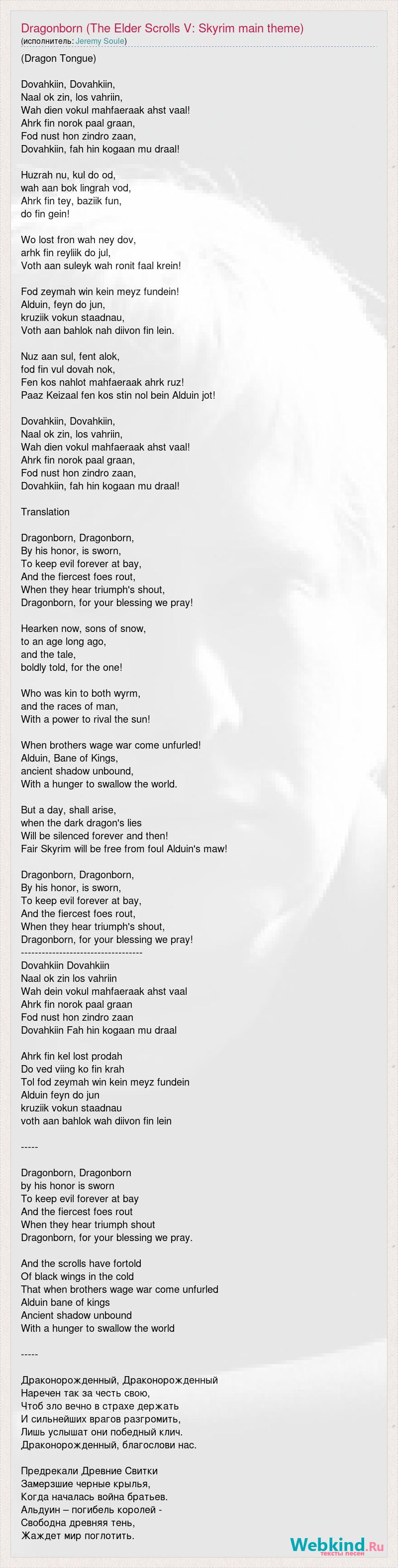 (Dragon Tongue) Dovahkiin, Dovahkiin, Naal ok zin, los vahriin, Wah dien vokul mahfaeraak ahst vaal! Ahrk fin norok paal graan, Fod nust hon zindro zaan, Dovahkiin, fah hin kogaan mu draal! Huzrah nu, kul do od, wah aan bok lingrah vod, Ahrk fin tey, baziik fun, do fin gein! Wo lost fron wah ney dov, arhk fin reyliik do jul, Voth aan suleyk wah ronit faal krein! Fod zeymah win kein meyz fundein! Alduin, feyn do jun, kruziik vokun staadnau, Voth aan bahlok nah diivon fin lein. Nuz aan sul, fent alok, fod fin vul dovah nok, Fen kos nahlot mahfaeraak ahrk ruz! Paaz Keizaal fen kos stin nol bein Alduin jot! Dovahkiin, Dovahkiin, Naal ok zin, los vahriin, Wah dien vokul mahfaeraak ahst vaal! Ahrk fin norok paal graan, Fod nust hon zindro zaan, Dovahkiin, fah hin kogaan mu draal! Translation Dragonborn, Dragonborn, By his honor, is sworn, To keep evil forever at bay, And the fiercest foes rout, When they hear triumph's shout, Dragonborn, for your blessing we pray! Hearken now, sons of snow, to an age long ago, and the tale, boldly told, for the one! Who was kin to both wyrm, and the races of man, With a power to rival the sun! When brothers wage war come unfurled! Alduin, Bane of Kings, ancient shadow unbound, With a hunger to swallow the world. But a day, shall arise, when the dark dragon's lies Will be silenced forever and then! Fair Skyrim will be free from foul Alduin's maw! Dragonborn, Dragonborn, By his honor, is sworn, To keep evil forever at bay, And the fiercest foes rout, When they hear triumph's shout, Dragonborn, for your blessing we pray! ----------------------------------- Dovahkiin Dovahkiin Naal ok zin los vahriin Wah dein vokul mahfaeraak ahst vaal Ahrk fin norok paal graan Fod nust hon zindro zaan Dovahkiin Fah hin kogaan mu draal Ahrk fin kel lost prodah Do ved viing ko fin krah Tol fod zeymah win kein meyz fundein Alduin feyn do jun kruziik vokun staadnau voth aan bahlok wah diivon fin lein ----- Dragonborn, Dragonborn by his honor is sworn To keep evil forever at bay And the fiercest foes rout When they hear triumph shout Dragonborn, for your blessing we pray. And the scrolls have fortold Of black wings in the cold That when brothers wage war come unfurled Alduin bane of kings Ancient shadow unbound With a hunger to swallow the world ----- Драконорожденный, Драконорожденный Наречен так за честь свою, Чтоб зло вечно в страхе держать И сильнейших врагов разгромить, Лишь услышат они победный клич. Драконорожденный, благослови нас. Предрекали Древние Свитки Замерзшие черные крылья, Когда началась война братьев. Альдуин – погибель королей - Свободна древняя тень, Жаждет мир поглотить.