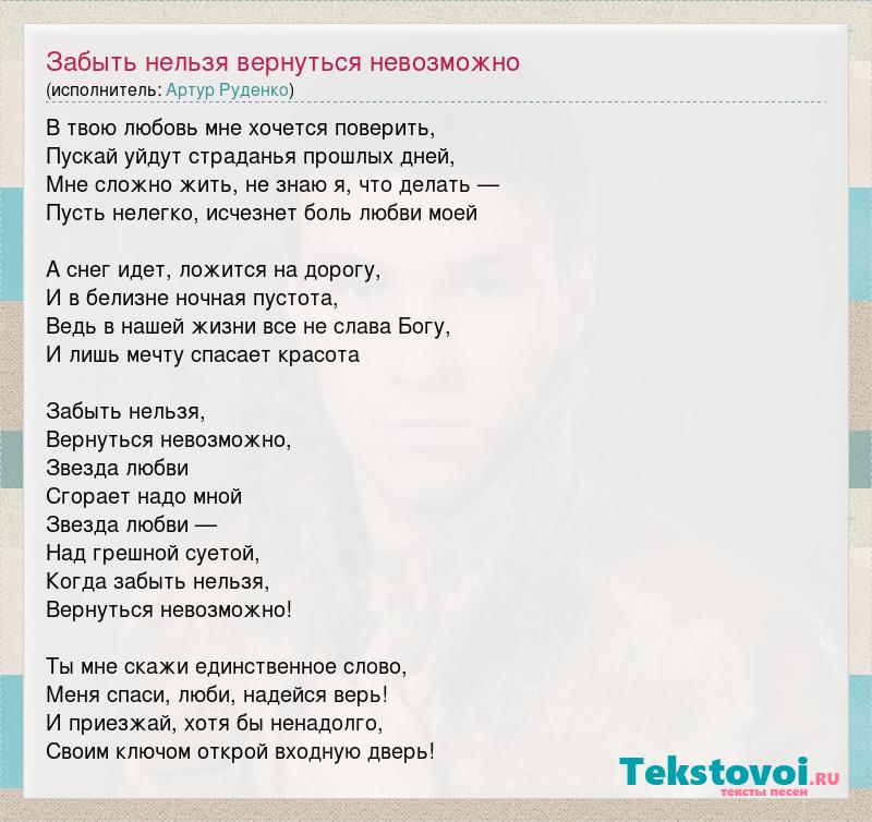 В твою любовь мне хочется поверить, Пускай уйдут страданья прошлых дней, Мне сложно жить, не знаю я, что делать — Пусть нелегко, исчезнет боль любви моей А снег идет, ложится на дорогу, И в белизне ночная пустота, Ведь в нашей жизни все не слава Богу, И лишь мечту спасает красота Забыть нельзя, Вернуться невозможно, Звезда любви Сгорает надо мной Звезда любви — Над грешной суетой, Когда забыть нельзя, Вернуться невозможно! Ты мне скажи единственное слово, Меня спаси, люби, надейся верь! И приезжай, хотя бы ненадолго, Своим ключом открой входную дверь!