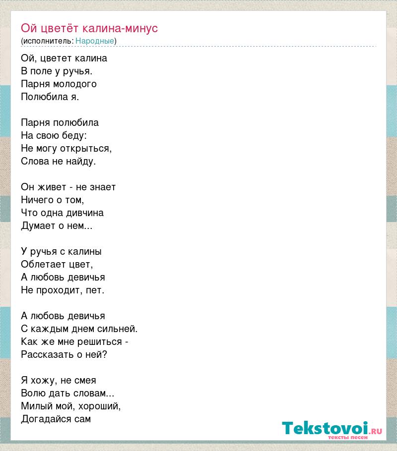 Ой, цветет калина В поле у ручья. Парня молодого Полюбила я. Парня полюбила На свою беду: Не могу открыться, Слова не найду. Он живет - не знает Ничего о том, Что одна дивчина Думает о нем... У ручья с калины Облетает цвет, А любовь девичья Не проходит, пет. А любовь девичья С каждым днем сильней. Как же мне решиться - Рассказать о ней? Я хожу, не смея Волю дать словам... Милый мой, хороший, Догадайся сам