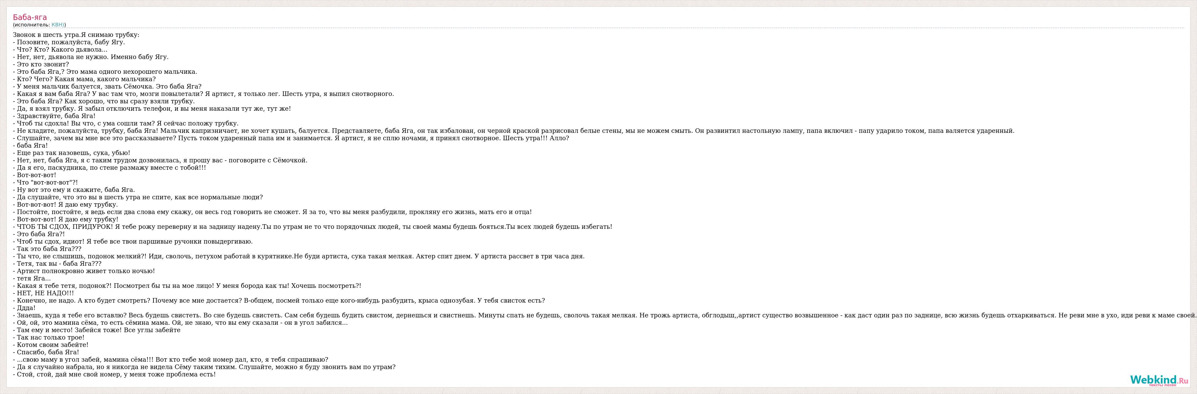 Звонок в шесть утра.Я снимаю трубку: - Позовите, пожалуйста, бабу Ягу. - Что? Кто? Какого дьявола... - Нет, нет, дьявола не нужно. Именно бабу Ягу. - Это кто звонит? - Это баба Яга,? Это мама одного нехорошего мальчика. - Кто? Чего? Какая мама, какого мальчика? - У меня мальчик балуется, звать Сёмочка. Это баба Яга? - Какая я вам баба Яга? У вас там что, мозги повылетали? Я артист, я только лег. Шесть утра, я выпил снотворного. - Это баба Яга? Как хорошо, что вы сразу взяли трубку. - Да, я взял трубку. Я забыл отключить телефон, и вы меня наказали тут же, тут же! - Здравствуйте, баба Яга! - Чтоб ты сдохла! Вы что, с ума сошли там? Я сейчас положу трубку. - Не кладите, пожалуйста, трубку, баба Яга! Мальчик капризничает, не хочет кушать, балуется. Представляете, баба Яга, он так избалован, он черной краской разрисовал белые стены, мы не можем смыть. Он развинтил настольную лампу, папа включил - папу ударило током, папа валяется ударенный. - Слушайте, зачем вы мне все это рассказываете? Пусть током ударенный папа им и занимается. Я артист, я не сплю ночами, я принял снотворное. Шесть утра!!! Алло? - баба Яга! - Еще раз так назовешь, сука, убью! - Нет, нет, баба Яга, я с таким трудом дозвонилась, я прошу вас - поговорите с Сёмочкой. - Да я его, паскудника, по стене размажу вместе с тобой!!! - Вот-вот-вот! - Что "вот-вот-вот"?! - Ну вот это ему и скажите, баба Яга. - Да слушайте, что это вы в шесть утра не спите, как все нормальные люди? - Вот-вот-вот! Я даю ему трубку. - Постойте, постойте, я ведь если два слова ему скажу, он весь год говорить не сможет. Я за то, что вы меня разбудили, прокляну его жизнь, мать его и отца! - Вот-вот-вот! Я даю ему трубку! - ЧТОБ ТЫ СДОХ, ПРИДУРОК! Я тебе рожу переверну и на задницу надену.Ты по утрам не то что порядочных людей, ты своей мамы будешь бояться.Ты всех людей будешь избегать! - Это баба Яга?! - Чтоб ты сдох, идиот! Я тебе все твои паршивые ручонки повыдергиваю. - Так это баба Яга??? - Ты что, не слышишь, подонок мелкий?! Иди, сволочь, петухом работай в курятнике.Не буди артиста, сука такая мелкая. Актер спит днем. У артиста рассвет в три часа дня. - Тетя, так вы - баба Яга??? - Артист полнокровно живет только ночью! - тетя Яга... - Какая я тебе тетя, подонок?! Посмотрел бы ты на мое лицо! У меня борода как ты! Хочешь посмотреть?! - НЕТ, НЕ НАДО!!! - Конечно, не надо. А кто будет смотреть? Почему все мне достается? В-общем, посмей только еще кого-нибудь разбудить, крыса однозубая. У тебя свисток есть? - Ддда! - Знаешь, куда я тебе его вставлю? Весь будешь свистеть. Во сне будешь свистеть. Сам себя будешь будить свистом, дернешься и свистнешь. Минуты спать не будешь, сволочь такая мелкая. Не трожь артиста, обглодыш,,артист существо возвышенное - как даст один раз по заднице, всю жизнь будешь отхаркиваться. Не реви мне в ухо, иди реви к маме своей. - Ой, ой, это мамина сёма, то есть сёмина мама. Ой, не знаю, что вы ему сказали - он в угол забился... - Там ему и место! Забейся тоже! Все углы забейте - Так нас только трое! - Котом своим забейте! - Спасибо, баба Яга! - ...свою маму в угол забей, мамина сёма!!! Вот кто тебе мой номер дал, кто, я тебя спрашиваю? - Да я случайно набрала, но я никогда не видела Сёму таким тихим. Слушайте, можно я буду звонить вам по утрам? - Стой, стой, дай мне свой номер, у меня тоже проблема есть!