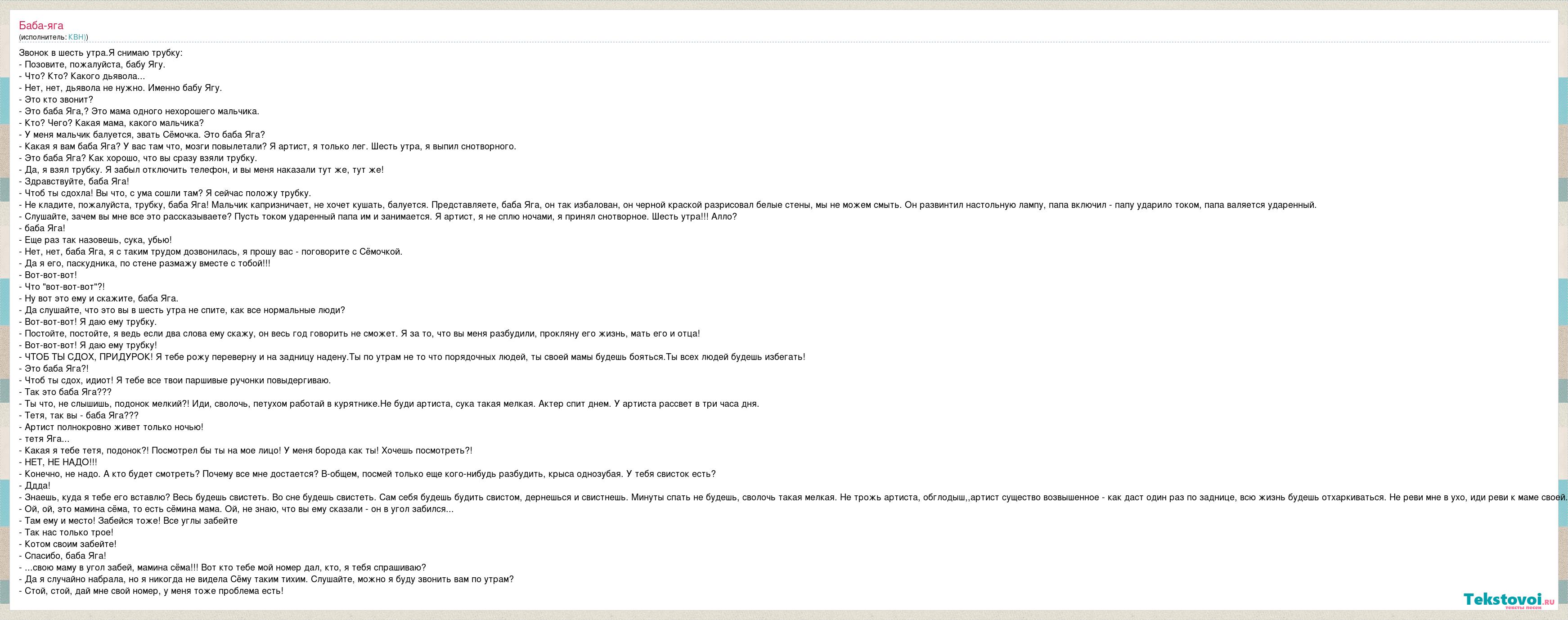 Звонок в шесть утра.Я снимаю трубку: - Позовите, пожалуйста, бабу Ягу. - Что? Кто? Какого дьявола... - Нет, нет, дьявола не нужно. Именно бабу Ягу. - Это кто звонит? - Это баба Яга,? Это мама одного нехорошего мальчика. - Кто? Чего? Какая мама, какого мальчика? - У меня мальчик балуется, звать Сёмочка. Это баба Яга? - Какая я вам баба Яга? У вас там что, мозги повылетали? Я артист, я только лег. Шесть утра, я выпил снотворного. - Это баба Яга? Как хорошо, что вы сразу взяли трубку. - Да, я взял трубку. Я забыл отключить телефон, и вы меня наказали тут же, тут же! - Здравствуйте, баба Яга! - Чтоб ты сдохла! Вы что, с ума сошли там? Я сейчас положу трубку. - Не кладите, пожалуйста, трубку, баба Яга! Мальчик капризничает, не хочет кушать, балуется. Представляете, баба Яга, он так избалован, он черной краской разрисовал белые стены, мы не можем смыть. Он развинтил настольную лампу, папа включил - папу ударило током, папа валяется ударенный. - Слушайте, зачем вы мне все это рассказываете? Пусть током ударенный папа им и занимается. Я артист, я не сплю ночами, я принял снотворное. Шесть утра!!! Алло? - баба Яга! - Еще раз так назовешь, сука, убью! - Нет, нет, баба Яга, я с таким трудом дозвонилась, я прошу вас - поговорите с Сёмочкой. - Да я его, паскудника, по стене размажу вместе с тобой!!! - Вот-вот-вот! - Что "вот-вот-вот"?! - Ну вот это ему и скажите, баба Яга. - Да слушайте, что это вы в шесть утра не спите, как все нормальные люди? - Вот-вот-вот! Я даю ему трубку. - Постойте, постойте, я ведь если два слова ему скажу, он весь год говорить не сможет. Я за то, что вы меня разбудили, прокляну его жизнь, мать его и отца! - Вот-вот-вот! Я даю ему трубку! - ЧТОБ ТЫ СДОХ, ПРИДУРОК! Я тебе рожу переверну и на задницу надену.Ты по утрам не то что порядочных людей, ты своей мамы будешь бояться.Ты всех людей будешь избегать! - Это баба Яга?! - Чтоб ты сдох, идиот! Я тебе все твои паршивые ручонки повыдергиваю. - Так это баба Яга??? - Ты что, не слышишь, подонок мелкий?! Иди, сволочь, петухом работай в курятнике.Не буди артиста, сука такая мелкая. Актер спит днем. У артиста рассвет в три часа дня. - Тетя, так вы - баба Яга??? - Артист полнокровно живет только ночью! - тетя Яга... - Какая я тебе тетя, подонок?! Посмотрел бы ты на мое лицо! У меня борода как ты! Хочешь посмотреть?! - НЕТ, НЕ НАДО!!! - Конечно, не надо. А кто будет смотреть? Почему все мне достается? В-общем, посмей только еще кого-нибудь разбудить, крыса однозубая. У тебя свисток есть? - Ддда! - Знаешь, куда я тебе его вставлю? Весь будешь свистеть. Во сне будешь свистеть. Сам себя будешь будить свистом, дернешься и свистнешь. Минуты спать не будешь, сволочь такая мелкая. Не трожь артиста, обглодыш,,артист существо возвышенное - как даст один раз по заднице, всю жизнь будешь отхаркиваться. Не реви мне в ухо, иди реви к маме своей. - Ой, ой, это мамина сёма, то есть сёмина мама. Ой, не знаю, что вы ему сказали - он в угол забился... - Там ему и место! Забейся тоже! Все углы забейте - Так нас только трое! - Котом своим забейте! - Спасибо, баба Яга! - ...свою маму в угол забей, мамина сёма!!! Вот кто тебе мой номер дал, кто, я тебя спрашиваю? - Да я случайно набрала, но я никогда не видела Сёму таким тихим. Слушайте, можно я буду звонить вам по утрам? - Стой, стой, дай мне свой номер, у меня тоже проблема есть!