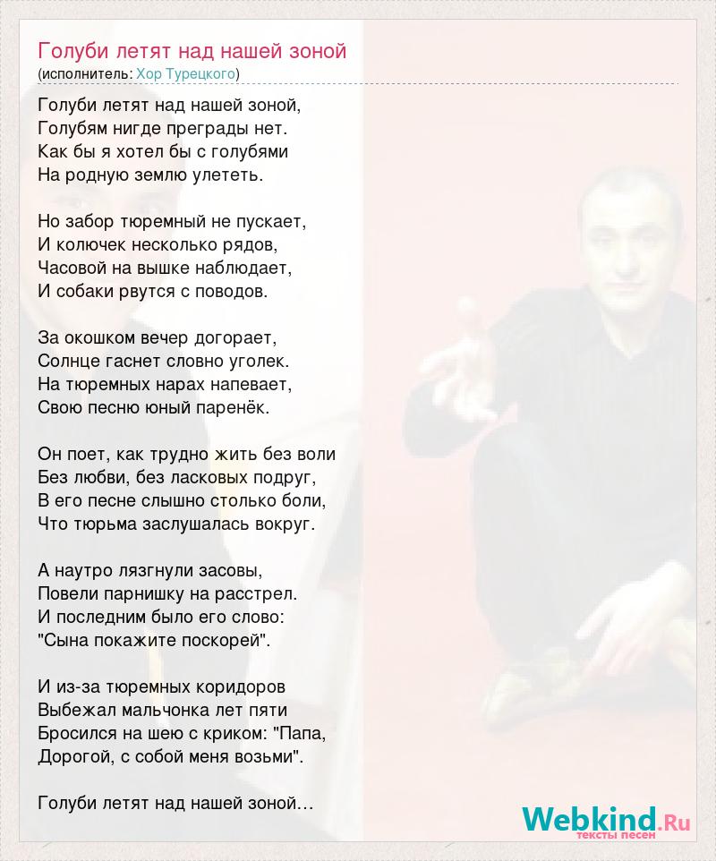 Голуби летят над нашей зоной, Голубям нигде преграды нет. Как бы я хотел бы с голубями На родную землю улететь. Но забор тюремный не пускает, И колючек несколько рядов, Часовой на вышке наблюдает, И собаки рвутся с поводов. За окошком вечер догорает, Солнце гаснет словно уголек. На тюремных нарах напевает, Свою песню юный паренёк. Он поет, как трудно жить без воли Без любви, без ласковых подруг, В его песне слышно столько боли, Что тюрьма заслушалась вокруг. А наутро лязгнули засовы, Повели парнишку на расстрел. И последним было его слово: "Сына покажите поскорей". И из-за тюремных коридоров Выбежал мальчонка лет пяти Бросился на шею с криком: "Папа, Дорогой, с собой меня возьми". Голуби летят над нашей зоной…