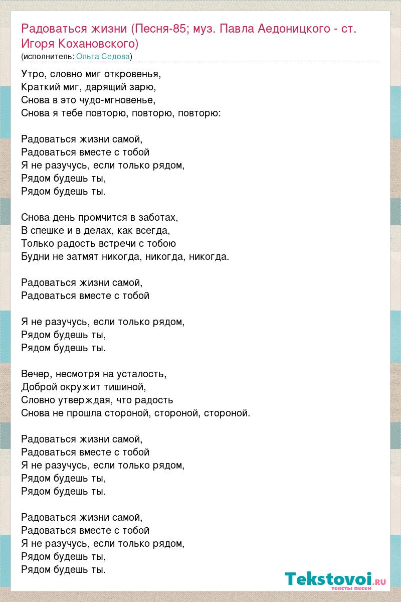 Утро, словно миг откровенья, Краткий миг, дарящий зарю, Снова в это чудо-мгновенье, Снова я тебе повторю, повторю, повторю: Радоваться жизни самой, Радоваться вместе с тобой Я не разучусь, если только рядом, Рядом будешь ты, Рядом будешь ты. Снова день промчится в заботах, В спешке и в делах, как всегда, Только радость встречи с тобою Будни не затмят никогда, никогда, никогда. Радоваться жизни самой, Радоваться вместе с тобой Я не разучусь, если только рядом, Рядом будешь ты, Рядом будешь ты. Вечер, несмотря на усталость, Доброй окружит тишиной, Словно утверждая, что радость Снова не прошла стороной, стороной, стороной. Радоваться жизни самой, Радоваться вместе с тобой Я не разучусь, если только рядом, Рядом будешь ты, Рядом будешь ты. Радоваться жизни самой, Радоваться вместе с тобой Я не разучусь, если только рядом, Рядом будешь ты, Рядом будешь ты.