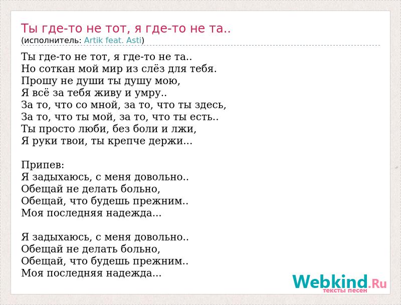 Ты где-то не тот, я где-то не та.. Но соткан мой мир из слёз для тебя. Прошу не души ты душу мою, Я всё за тебя живу и умру.. За то, что со мной, за то, что ты здесь, За то, что ты мой, за то, что ты есть.. Ты просто люби, без боли и лжи, Я руки твои, ты крепче держи... Припев: Я задыхаюсь, с меня довольно.. Обещай не делать больно, Обещай, что будешь прежним.. Моя последняя надежда... Я задыхаюсь, с меня довольно.. Обещай не делать больно, Обещай, что будешь прежним.. Моя последняя надежда...