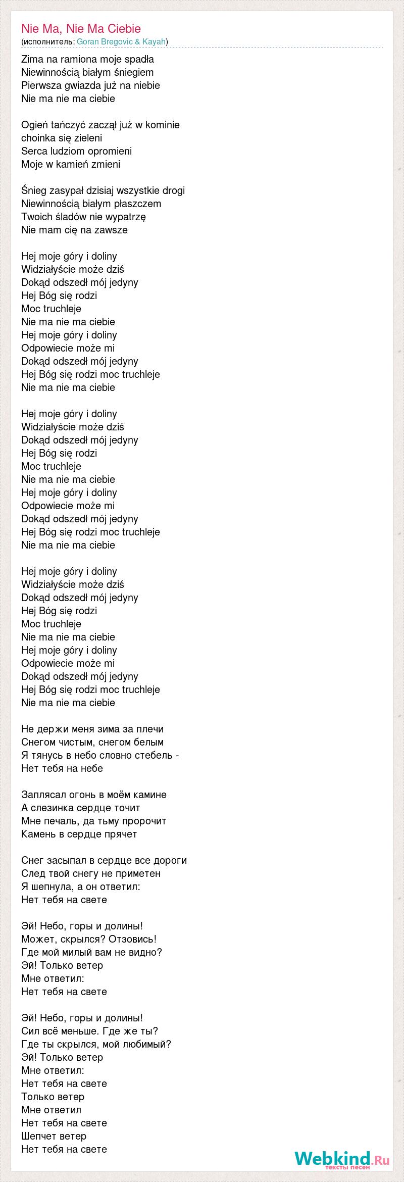 Zima na ramiona moje spadła Niewinnością białym śniegiem Pierwsza gwiazda już na niebie Nie ma nie ma ciebie Ogień tańczyć zaczął już w kominie choinka się zieleni Serca ludziom opromieni Moje w kamień zmieni Śnieg zasypał dzisiaj wszystkie drogi Niewinnością białym płaszczem Twoich śladów nie wypatrzę Nie mam cię na zawsze Hej moje góry i doliny Widziałyście może dziś Dokąd odszedł mój jedyny Hej Bóg się rodzi Moc truchleje Nie ma nie ma ciebie Hej moje góry i doliny Odpowiecie może mi Dokąd odszedł mój jedyny Hej Bóg się rodzi moc truchleje Nie ma nie ma ciebie Hej moje góry i doliny Widziałyście może dziś Dokąd odszedł mój jedyny Hej Bóg się rodzi Moc truchleje Nie ma nie ma ciebie Hej moje góry i doliny Odpowiecie może mi Dokąd odszedł mój jedyny Hej Bóg się rodzi moc truchleje Nie ma nie ma ciebie Hej moje góry i doliny Widziałyście może dziś Dokąd odszedł mój jedyny Hej Bóg się rodzi Moc truchleje Nie ma nie ma ciebie Hej moje góry i doliny Odpowiecie może mi Dokąd odszedł mój jedyny Hej Bóg się rodzi moc truchleje Nie ma nie ma ciebie Не держи меня зима за плечи Снегом чистым, снегом белым Я тянусь в небо словно стебель - Нет тебя на небе Заплясал огонь в моём камине А слезинка сердце точит Мне печаль, да тьму пророчит Камень в сердце прячет Снег засыпал в сердце все дороги След твой снегу не приметен Я шепнула, а он ответил: Нет тебя на свете Эй! Небо, горы и долины! Может, скрылся? Отзовись! Где мой милый вам не видно? Эй! Только ветер Мне ответил: Нет тебя на свете Эй! Небо, горы и долины! Сил всё меньше. Где же ты? Где ты скрылся, мой любимый? Эй! Только ветер Мне ответил: Нет тебя на свете Только ветер Мне ответил Нет тебя на свете Шепчет ветер Нет тебя на свете