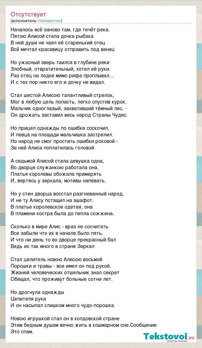 Началось всё заново там, где течёт река. Пятою Алисой стала дочка рыбака В ней души не чаял её старенький отец Всё мечтал красавицу отправить под венец Но ужасный зверь таился в глубине реки Злобный, отвратительный, хотел её руки. Раз отец на лодке мимо рифа проплывал... И с тех пор никто его и дочку не видал. Стал шестой Алисою талантливый стрелок, Мог в любую цель попасть, легко спустив курок. Мальчик одноглазый, захвативший тёмный лес, - Он дрожать заставил весь народ Страны Чудес. Но прицел однажды по ошибке соскочил, И певца на площади мальчишка застрелил. Но народ не смог простить ошибки роковой - За неё Алиса поплатилась головой. А седьмой Алисой стала девушка одна, Во дворце служанкою работала она. Платья королевы обожала примерять И, вертясь у зеркала, мотивы напевать. Но у стен дворца восстал разгневанный народ, И не ту Алису потащил на эшафот. В платье королевское одетая, она В пламени костра была до пепла сожжена. Сколько в мире Алис - враз не сосчитать Все забыли что их в начале было пять. И что ни день то во дворце прекрасный бал Ведь их так много в стране Зеркал Стал целитель новою Алисою восьмой Порошки и травы - все имел он под рукой. Жизней человеческих отшельник знал секрет Обещал, что проживут больные сотни лет. Но дрогнула однажды Целителя рука И он насыпал слишком много чудо-порошка. Новою игрушкой стал он в колдовской стране Этим бедным душам вечно жить в кошмарном сне.Сообщение Это спам.