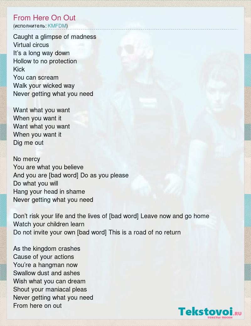 Caught a glimpse of madness Virtual circus It’s a long way down Hollow to no protection Kick You can scream Walk your wicked way Never getting what you need Want what you want When you want it Want what you want When you want it Dig me out No mercy You are what you believe And you are incomplete Do as you please Do what you will Hang your head in shame Never getting what you need Don’t risk your life and the lives of your comrades Leave now and go home Watch your children learn Do not invite your own destruction This is a road of no return As the kingdom crashes Cause of your actions You’re a hangman now Swallow dust and ashes Wish what you can dream Shout your maniacal pleas Never getting what you need From here on out