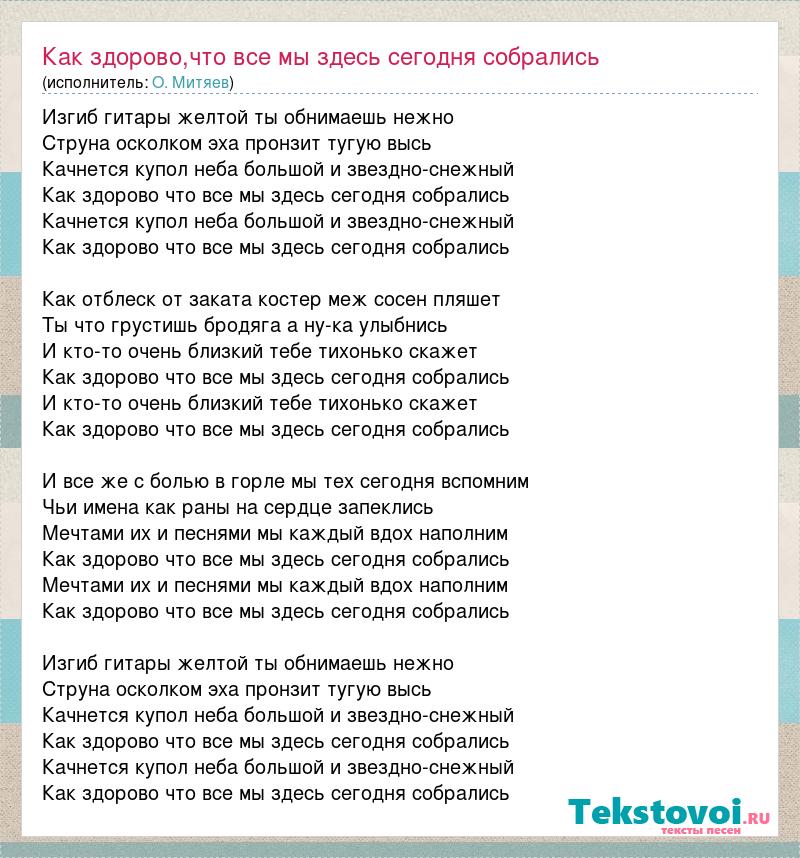 Изгиб гитары желтой ты обнимаешь нежно Струна осколком эха пронзит тугую высь Качнется купол неба большой и звездно-снежный Как здорово что все мы здесь сегодня собрались Качнется купол неба большой и звездно-снежный Как здорово что все мы здесь сегодня собрались Как отблеск от заката костер меж сосен пляшет Ты что грустишь бродяга а ну-ка улыбнись И кто-то очень близкий тебе тихонько скажет Как здорово что все мы здесь сегодня собрались И кто-то очень близкий тебе тихонько скажет Как здорово что все мы здесь сегодня собрались И все же с болью в горле мы тех сегодня вспомним Чьи имена как раны на сердце запеклись Мечтами их и песнями мы каждый вдох наполним Как здорово что все мы здесь сегодня собрались Мечтами их и песнями мы каждый вдох наполним Как здорово что все мы здесь сегодня собрались Изгиб гитары желтой ты обнимаешь нежно Струна осколком эха пронзит тугую высь Качнется купол неба большой и звездно-снежный Как здорово что все мы здесь сегодня собрались Качнется купол неба большой и звездно-снежный Как здорово что все мы здесь сегодня собрались