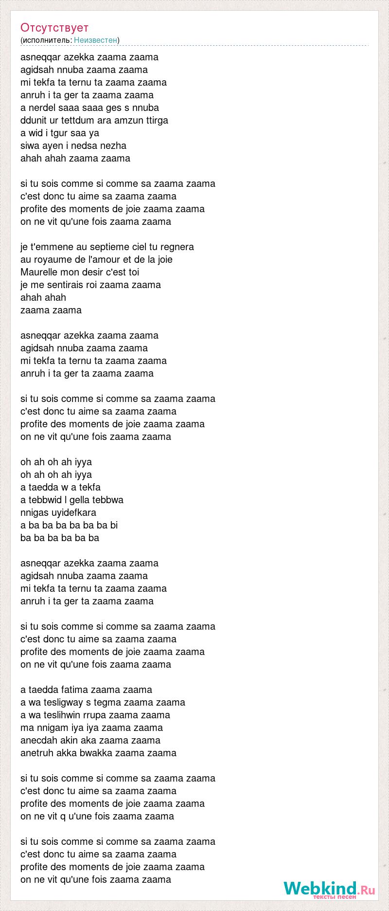 asneqqar azekka zaama zaama agidsah nnuba zaama zaama mi tekfa ta ternu ta zaama zaama anruh i ta ger ta zaama zaama a nerdel saaa saaa ges s nnuba ddunit ur tettdum ara amzun ttirga a wid i tgur saa ya siwa ayen i nedsa nezha ahah ahah zaama zaama si tu sois comme si comme sa zaama zaama c'est donc tu aime sa zaama zaama profite des moments de joie zaama zaama on ne vit qu'une fois zaama zaama je t'emmene au septieme ciel tu regnera au royaume de l'amour et de la joie Maurelle mon desir c'est toi je me sentirais roi zaama zaama ahah ahah zaama zaama asneqqar azekka zaama zaama agidsah nnuba zaama zaama mi tekfa ta ternu ta zaama zaama anruh i ta ger ta zaama zaama si tu sois comme si comme sa zaama zaama c'est donc tu aime sa zaama zaama profite des moments de joie zaama zaama on ne vit qu'une fois zaama zaama oh ah oh ah iyya oh ah oh ah iyya a taedda w a tekfa a tebbwid l gella tebbwa nnigas uyidefkara a ba ba ba ba ba ba bi ba ba ba ba ba ba asneqqar azekka zaama zaama agidsah nnuba zaama zaama mi tekfa ta ternu ta zaama zaama anruh i ta ger ta zaama zaama si tu sois comme si comme sa zaama zaama c'est donc tu aime sa zaama zaama profite des moments de joie zaama zaama on ne vit qu'une fois zaama zaama a taedda fatima zaama zaama a wa tesligway s tegma zaama zaama a wa teslihwin rrupa zaama zaama ma nnigam iya iya zaama zaama anecdah akin aka zaama zaama anetruh akka bwakka zaama zaama si tu sois comme si comme sa zaama zaama c'est donc tu aime sa zaama zaama profite des moments de joie zaama zaama on ne vit q u'une fois zaama zaama si tu sois comme si comme sa zaama zaama c'est donc tu aime sa zaama zaama profite des moments de joie zaama zaama on ne vit qu'une fois zaama zaama