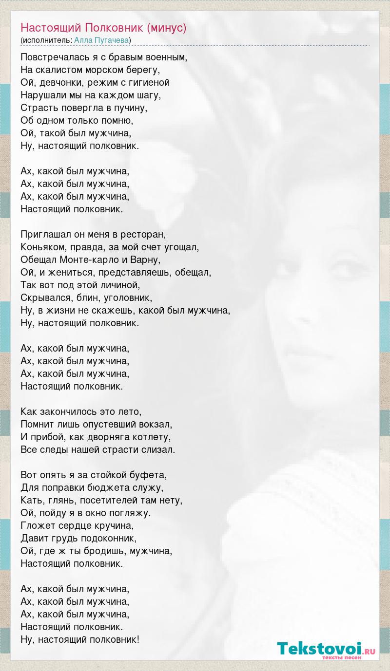Повстречалась я с бравым военным, На скалистом морском берегу, Ой, девчонки, режим с гигиеной Нарушали мы на каждом шагу, Страсть повергла в пучину, Об одном только помню, Ой, такой был мужчина, Ну, настоящий полковник. Ах, какой был мужчина, Ах, какой был мужчина, Ах, какой был мужчина, Настоящий полковник. Приглашал он меня в ресторан, Коньяком, правда, за мой счет угощал, Обещал Монте-карло и Варну, Ой, и жениться, представляешь, обещал, Так вот под этой личиной, Скрывался, блин, уголовник, Ну, в жизни не скажешь, какой был мужчина, Ну, настоящий полковник. Ах, какой был мужчина, Ах, какой был мужчина, Ах, какой был мужчина, Настоящий полковник. Как закончилось это лето, Помнит лишь опустевший вокзал, И прибой, как дворняга котлету, Все следы нашей страсти слизал. Вот опять я за стойкой буфета, Для поправки бюджета служу, Кать, глянь, посетителей там нету, Ой, пойду я в окно погляжу. Гложет сердце кручина, Давит грудь подоконник, Ой, где ж ты бродишь, мужчина, Настоящий полковник. Ах, какой был мужчина, Ах, какой был мужчина, Ах, какой был мужчина, Настоящий полковник. Ну, настоящий полковник!