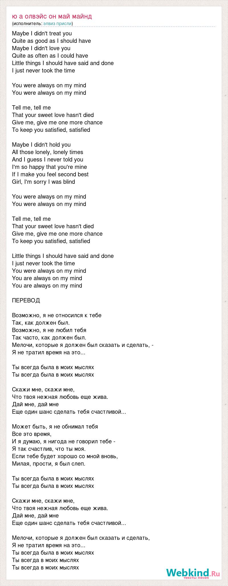 Maybe I didn't treat you Quite as good as I should have Maybe I didn't love you Quite as often as I could have Little things I should have said and done I just never took the time You were always on my mind You were always on my mind Tell me, tell me That your sweet love hasn't died Give me, give me one more chance To keep you satisfied, satisfied Maybe I didn't hold you All those lonely, lonely times And I guess I never told you I'm so happy that you're mine If I make you feel second best Girl, I'm sorry I was blind You were always on my mind You were always on my mind Tell me, tell me That your sweet love hasn't died Give me, give me one more chance To keep you satisfied, satisfied Little things I should have said and done I just never took the time You were always on my mind You are always on my mind You are always on my mind ПЕРЕВОД Возможно, я не относился к тебе Так, как должен был. Возможно, я не любил тебя Так часто, как должен был. Мелочи, которые я должен был сказать и сделать, - Я не тратил время на это... Ты всегда была в моих мыслях Ты всегда была в моих мыслях Скажи мне, скажи мне, Что твоя нежная любовь еще жива. Дай мне, дай мне Еще один шанс сделать тебя счастливой... Может быть, я не обнимал тебя Все это время, И я думаю, я нигода не говорил тебе - Я так счастлив, что ты моя. Если тебе будет хорошо со мной вновь, Милая, прости, я был слеп. Ты всегда была в моих мыслях Ты всегда была в моих мыслях Скажи мне, скажи мне, Что твоя нежная любовь еще жива. Дай мне, дай мне Еще один шанс сделать тебя счастливой... Мелочи, которые я должен был сказать и сделать, Я не тратил время на это... Ты всегда была в моих мыслях Ты всегда в моих мыслях Ты всегда в моих мыслях