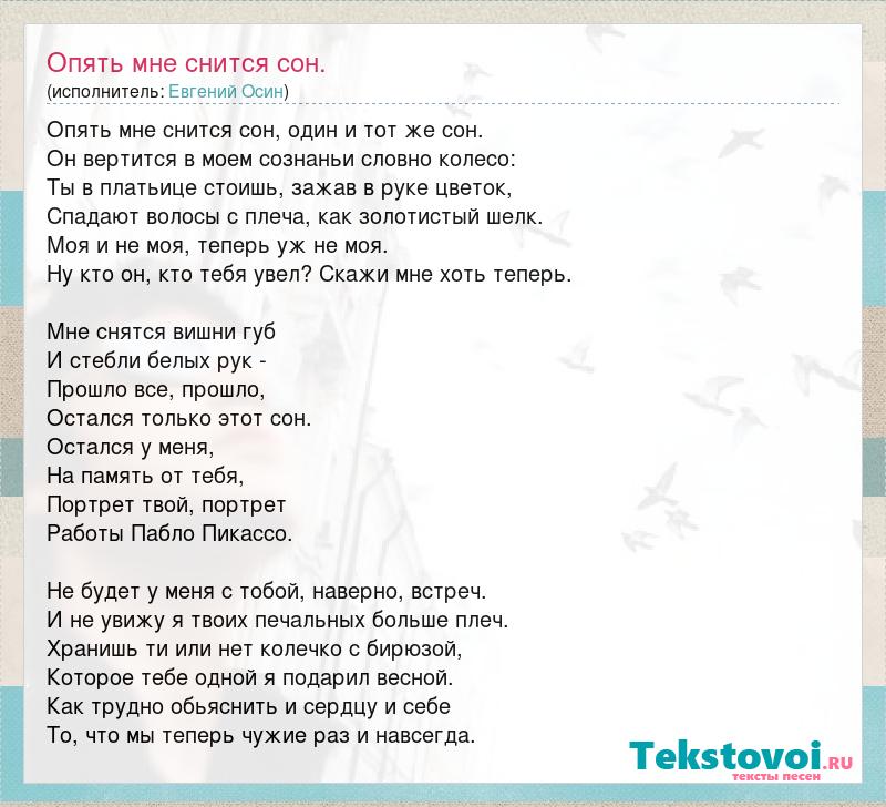 Опять мне снится сон, один и тот же сон. Он вертится в моем сознаньи словно колесо: Ты в платьице стоишь, зажав в руке цветок, Спадают волосы с плеча, как золотистый шелк. Моя и не моя, теперь уж не моя. Ну кто он, кто тебя увел? Скажи мне хоть теперь. Мне снятся вишни губ И стебли белых рук - Прошло все, прошло, Остался только этот сон. Остался у меня, На память от тебя, Портрет твой, портрет Работы Пабло Пикассо. Не будет у меня с тобой, наверно, встреч. И не увижу я твоих печальных больше плеч. Хранишь ти или нет колечко с бирюзой, Которое тебе одной я подарил весной. Как трудно обьяснить и сердцу и себе То, что мы теперь чужие раз и навсегда.