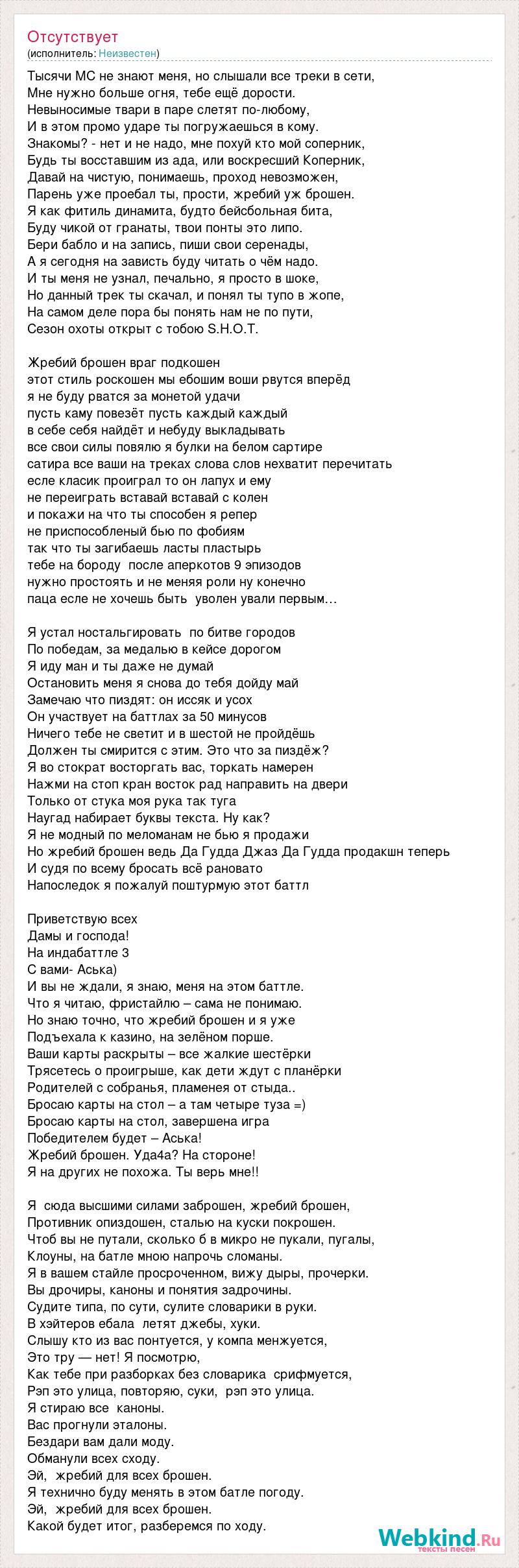 Тысячи MC не знают меня, но слышали все треки в сети, Мне нужно больше огня, тебе ещё дорости. Невыносимые твари в паре слетят по-любому, И в этом промо ударе ты погружаешься в кому. Знакомы? - нет и не надо, мне похуй кто мой соперник, Будь ты восставшим из ада, или воскресший Коперник, Давай на чистую, понимаешь, проход невозможен, Парень уже проебал ты, прости, жребий уж брошен. Я как фитиль динамита, будто бейсбольная бита, Буду чикой от гранаты, твои понты это липо. Бери бабло и на запись, пиши свои серенады, А я сегодня на зависть буду читать о чём надо. И ты меня не узнал, печально, я просто в шоке, Но данный трек ты скачал, и понял ты тупо в жопе, На самом деле пора бы понять нам не по пути, Сезон охоты открыт с тобою S.H.O.T. Жребий брошен враг подкошен этот стиль роскошен мы ебошим воши рвутся вперёд я не буду рватся за монетой удачи пусть каму повезёт пусть каждый каждый в себе себя найдёт и небуду выкладывать все свои силы повялю я булки на белом сартире сатира все ваши на треках слова слов нехватит перечитать есле класик проиграл то он лапух и ему не переиграть вставай вставай с колен и покажи на что ты способен я репер не приспособленый бью по фобиям так что ты загибаешь ласты пластырь тебе на бороду после аперкотов 9 эпизодов нужно простоять и не меняя роли ну конечно паца есле не хочешь быть уволен ували первым… Я устал ностальгировать по битве городов По победам, за медалью в кейсе дорогом Я иду ман и ты даже не думай Остановить меня я снова до тебя дойду май Замечаю что пиздят: он иссяк и усох Он участвует на баттлах за 50 минусов Ничего тебе не светит и в шестой не пройдёшь Должен ты смирится с этим. Это что за пиздёж? Я во стократ восторгать вас, торкать намерен Нажми на стоп кран восток рад направить на двери Только от стука моя рука так туга Наугад набирает буквы текста. Ну как? Я не модный по меломанам не бью я продажи Но жребий брошен ведь Да Гудда Джаз Да Гудда продакшн теперь И судя по всему бросать всё рановато Напоследок я пожалуй поштурмую этот баттл Приветствую всех Дамы и господа! На индабаттле 3 С вами- Аська) И вы не ждали, я знаю, меня на этом баттле. Что я читаю, фристайлю – сама не понимаю. Но знаю точно, что жребий брошен и я уже Подъехала к казино, на зелёном порше. Ваши карты раскрыты – все жалкие шестёрки Трясетесь о проигрыше, как дети ждут с планёрки Родителей с собранья, пламенея от стыда.. Бросаю карты на стол – а там четыре туза =) Бросаю карты на стол, завершена игра Победителем будет – Аська! Жребий брошен. Уда4а? На стороне! Я на других не похожа. Ты верь мне!! Я сюда высшими силами заброшен, жребий брошен, Противник опиздошен, сталью на куски покрошен. Чтоб вы не путали, сколько б в микро не пукали, пугалы, Клоуны, на батле мною напрочь сломаны. Я в вашем стайле просроченном, вижу дыры, прочерки. Вы дрочиры, каноны и понятия задрочины. Судите типа, по сути, сулите словарики в руки. В хэйтеров ебала летят джебы, хуки. Слышу кто из вас понтуется, у компа менжуется, Это тру — нет! Я посмотрю, Как тебе при разборках без словарика срифмуется, Рэп это улица, повторяю, суки, рэп это улица. Я стираю все каноны. Вас прогнули эталоны. Бездари вам дали моду. Обманули всех сходу. Эй, жребий для всех брошен. Я технично буду менять в этом батле погоду. Эй, жребий для всех брошен. Какой будет итог, разберемся по ходу.