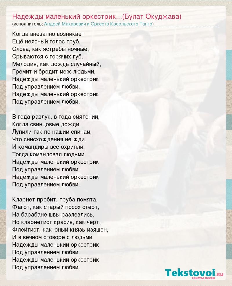 Когда внезапно возникает Ещё неясный голос труб, Слова, как ястребы ночные, Срываются с горячих губ. Мелодия, как дождь случайный, Гремит и бродит меж людьми, Надежды маленький оркестрик Под управлением любви. Надежды маленький оркестрик Под управлением любви. В года разлук, в года смятений, Когда свинцовые дожди Лупили так по нашим спинам, Что снисхождения не жди. И командиры все охрипли, Тогда командовал людьми Надежды маленький оркестрик Под управлением любви. Надежды маленький оркестрик Под управлением любви. Кларнет пробит, труба помята, Фагот, как старый посох стёрт, На барабане швы разлезлись, Но кларнетист красив, как чёрт. Флейтист, как юный князь изящен, И в вечном сговоре с людьми Надежды маленький оркестрик Под управлением любви. Надежды маленький оркестрик Под управлением любви.