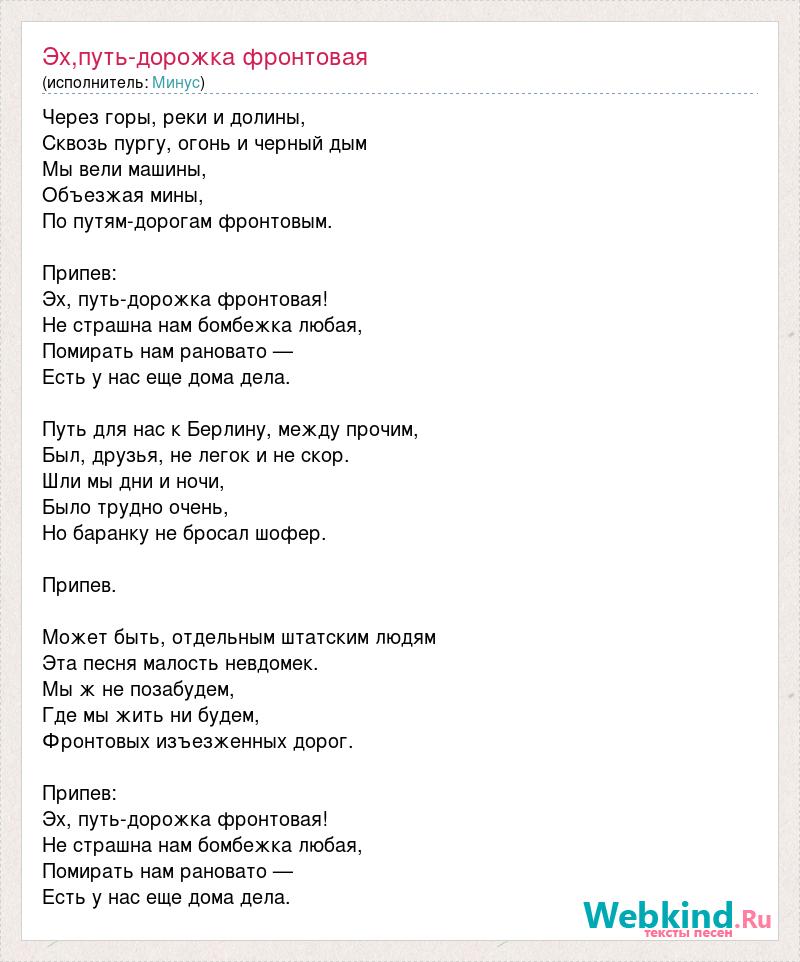 Через горы, реки и долины, Сквозь пургу, огонь и черный дым Мы вели машины, Объезжая мины, По путям-дорогам фронтовым. Припев: Эх, путь-дорожка фронтовая! Не страшна нам бомбежка любая, Помирать нам рановато — Есть у нас еще дома дела. Путь для нас к Берлину, между прочим, Был, друзья, не легок и не скор. Шли мы дни и ночи, Было трудно очень, Но баранку не бросал шофер. Припев. Может быть, отдельным штатским людям Эта песня малость невдомек. Мы ж не позабудем, Где мы жить ни будем, Фронтовых изъезженных дорог. Припев: Эх, путь-дорожка фронтовая! Не страшна нам бомбежка любая, Помирать нам рановато — Есть у нас еще дома дела.