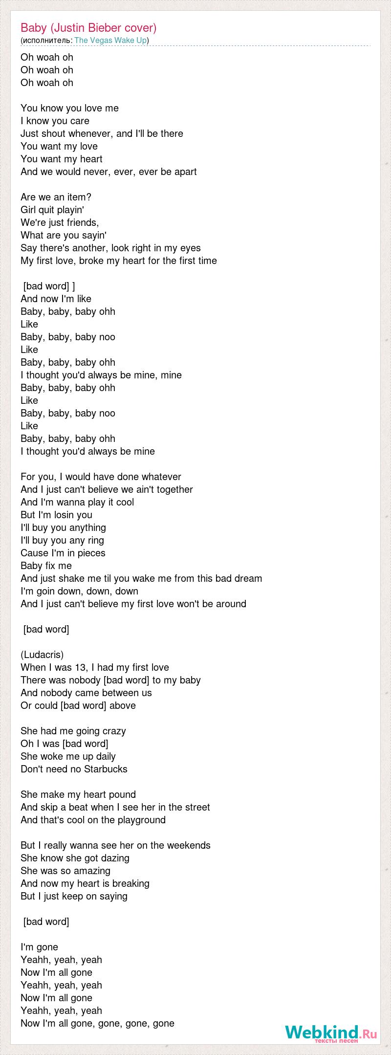 Oh woah oh Oh woah oh Oh woah oh You know you love me I know you care Just shout whenever, and I'll be there You want my love You want my heart And we would never, ever, ever be apart Are we an item? Girl quit playin' We're just friends, What are you sayin' Say there's another, look right in my eyes My first love, broke my heart for the first time [bad word] ] And now I'm like Baby, baby, baby ohh Like Baby, baby, baby noo Like Baby, baby, baby ohh I thought you'd always be mine, mine Baby, baby, baby ohh Like Baby, baby, baby noo Like Baby, baby, baby ohh I thought you'd always be mine For you, I would have done whatever And I just can't believe we ain't together And I'm wanna play it cool But I'm losin you I'll buy you anything I'll buy you any ring Cause I'm in pieces Baby fix me And just shake me til you wake me from this bad dream I'm goin down, down, down And I just can't believe my first love won't be around [bad word] (Ludacris) When I was 13, I had my first love There was nobody [bad word] to my baby And nobody came between us Or could [bad word] above She had me going crazy Oh I was [bad word] She woke me up daily Don't need no Starbucks She make my heart pound And skip a beat when I see her in the street And that's cool on the playground But I really wanna see her on the weekends She know she got dazing She was so amazing And now my heart is breaking But I just keep on saying [bad word] I'm gone Yeahh, yeah, yeah Now I'm all gone Yeahh, yeah, yeah Now I'm all gone Yeahh, yeah, yeah Now I'm all gone, gone, gone, gone