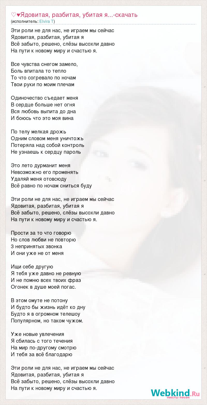 Эти роли не для нас, не играем мы сейчас Ядовитая, разбитая, убитая я Всё забыто, решено, слёзы высохли давно На пути к новому миру и счастью я. Все чувства снегом замело, Боль впитала то тепло То что согревало по ночам Твои руки по моим плечам Одиночество съедает меня В сердце больше нет огня Вся любовь выпита до дна И боюсь что это моя вина По телу мелкая дрожь Одним словом меня уничтожь Потеряла над собой контроль Не узнаешь к сердцу пароль Это лето дурманит меня Невозможно его променять Удаляй меня отовсюду Всё равно по ночам сниться буду Эти роли не для нас, не играем мы сейчас Ядовитая, разбитая, убитая я Всё забыто, решено, слёзы высохли давно На пути к новому миру и счастью я. Прости за то что говорю Но слов любви не повторю 3 непринятых звонка И они уже не от меня Ищи себе другую Я тебя уже давно не ревную И не помню всех твоих фраз Огонек в душе моей погас. В этом омуте не потону И будто бы жизнь идёт ко дну Будто я в огромном телешоу Популярном, но таком чужом. Уже новые увлечения Я сбилась с того течения На мир по-другому смотрю И тебя за всё благодарю Эти роли не для нас, не играем мы сейчас Ядовитая, разбитая, убитая я Всё забыто, решено, слёзы высохли давно На пути к новому миру и счастью я.