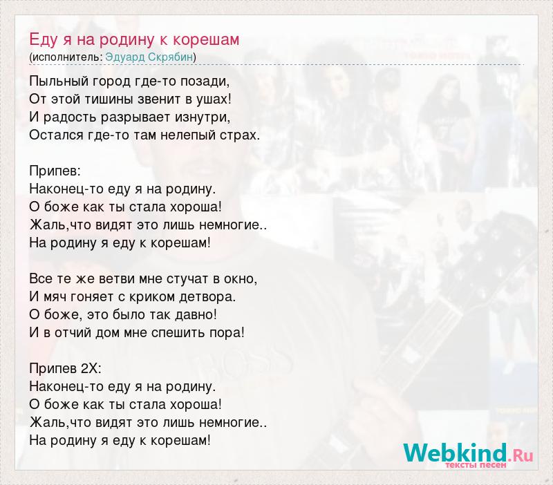 Пыльный город где-то позади, От этой тишины звенит в ушах! И радость разрывает изнутри, Остался где-то там нелепый страх. Припев: Наконец-то еду я на родину. О боже как ты стала хороша! Жаль,что видят это лишь немногие.. На родину я еду к корешам! Все те же ветви мне стучат в окно, И мяч гоняет с криком детвора. О боже, это было так давно! И в отчий дом мне спешить пора! Припев 2X: Наконец-то еду я на родину. О боже как ты стала хороша! Жаль,что видят это лишь немногие.. На родину я еду к корешам!