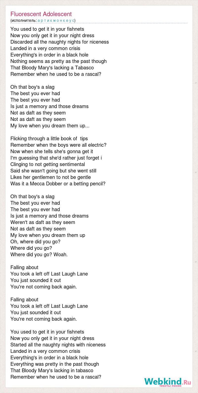 You used to get it in your fishnets Now you only get it in your night dress Discarded all the naughty nights for niceness Landed in a very common crisis Everything's in order in a black hole Nothing seems as pretty as the past though That Bloody Mary's lacking a Tabasco Remember when he used to be a rascal? Oh that boy's a slag The best you ever had The best you ever had Is just a memory and those dreams Not as daft as they seem Not as daft as they seem My love when you dream them up... Flicking through a little book of tips Remember when the boys were all electric? Now when she tells she's gonna get it I'm guessing that she'd rather just forget i Clinging to not getting sentimental Said she wasn't going but she went still Likes her gentlemen to not be gentle Was it a Mecca Dobber or a betting pencil? Oh that boy's a slag The best you ever had The best you ever had Is just a memory and those dreams Weren't as daft as they seem Not as daft as they seem My love when you dream them up Oh, where did you go? Where did you go? Where did you go? Woah. Falling about You took a left off Last Laugh Lane You just sounded it out You're not coming back again. Falling about You took a left off Last Laugh Lane You just sounded it out You're not coming back again. You used to get it in your fishnets Now you only get it in your night dress Started all the naughty nights with niceness Landed in a very common crisis Everything's in order in a black hole Everything was pretty in the past though That Bloody Mary's lacking in tabasco Remember when he used to be a rascal?