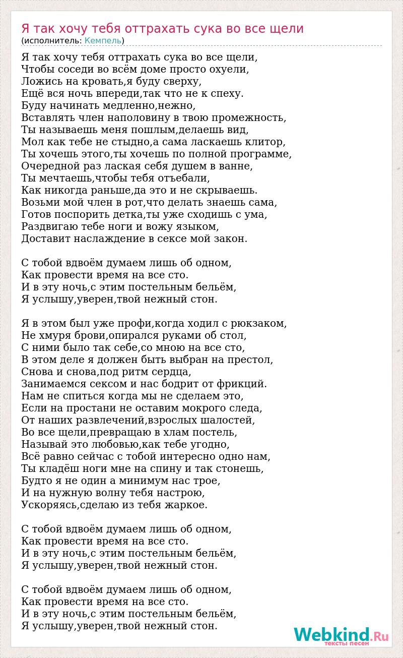 Я так хочу тебя оттрахать сука во все щели, Чтобы соседи во всём доме просто охуели, Ложись на кровать,я буду сверху, Ещё вся ночь впереди,так что не к спеху. Буду начинать медленно,нежно, Вставлять член наполовину в твою промежность, Ты называешь меня пошлым,делаешь вид, Мол как тебе не стыдно,а сама ласкаешь клитор, Ты хочешь этого,ты хочешь по полной программе, Очередной раз лаская себя душем в ванне, Ты мечтаешь,чтобы тебя отъебали, Как никогда раньше,да это и не скрываешь. Возьми мой член в рот,что делать знаешь сама, Готов поспорить детка,ты уже сходишь с ума, Раздвигаю тебе ноги и вожу языком, Доставит наслаждение в сексе мой закон. С тобой вдвоём думаем лишь об одном, Как провести время на все сто. И в эту ночь,с этим постельным бельём, Я услышу,уверен,твой нежный стон. Я в этом был уже профи,когда ходил с рюкзаком, Не хмуря брови,опирался руками об стол, С ними было так себе,со мною на все сто, В этом деле я должен быть выбран на престол, Снова и снова,под ритм сердца, Занимаемся сексом и нас бодрит от фрикций. Нам не спиться когда мы не сделаем это, Если на простани не оставим мокрого следа, От наших развлечений,взрослых шалостей, Во все щели,превращаю в хлам постель, Называй это любовью,как тебе угодно, Всё равно сейчас с тобой интересно одно нам, Ты кладёш ноги мне на спину и так стонешь, Будто я не один а минимум нас трое, И на нужную волну тебя настрою, Ускоряясь,сделаю из тебя жаркое. С тобой вдвоём думаем лишь об одном, Как провести время на все сто. И в эту ночь,с этим постельным бельём, Я услышу,уверен,твой нежный стон. С тобой вдвоём думаем лишь об одном, Как провести время на все сто. И в эту ночь,с этим постельным бельём, Я услышу,уверен,твой нежный стон.