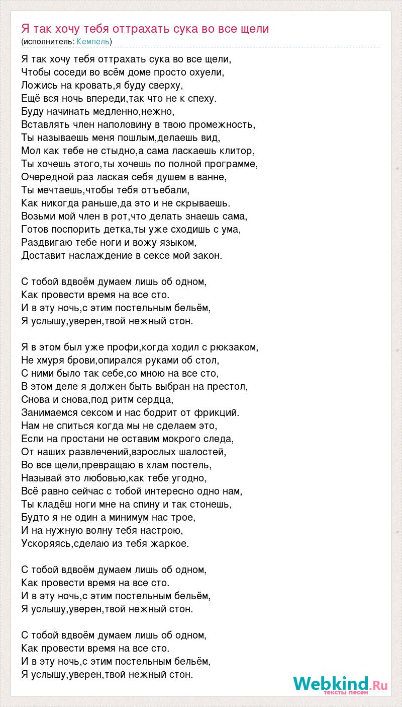 Я так хочу тебя оттрахать сука во все щели, Чтобы соседи во всём доме просто охуели, Ложись на кровать,я буду сверху, Ещё вся ночь впереди,так что не к спеху. Буду начинать медленно,нежно, Вставлять член наполовину в твою промежность, Ты называешь меня пошлым,делаешь вид, Мол как тебе не стыдно,а сама ласкаешь клитор, Ты хочешь этого,ты хочешь по полной программе, Очередной раз лаская себя душем в ванне, Ты мечтаешь,чтобы тебя отъебали, Как никогда раньше,да это и не скрываешь. Возьми мой член в рот,что делать знаешь сама, Готов поспорить детка,ты уже сходишь с ума, Раздвигаю тебе ноги и вожу языком, Доставит наслаждение в сексе мой закон. С тобой вдвоём думаем лишь об одном, Как провести время на все сто. И в эту ночь,с этим постельным бельём, Я услышу,уверен,твой нежный стон. Я в этом был уже профи,когда ходил с рюкзаком, Не хмуря брови,опирался руками об стол, С ними было так себе,со мною на все сто, В этом деле я должен быть выбран на престол, Снова и снова,под ритм сердца, Занимаемся сексом и нас бодрит от фрикций. Нам не спиться когда мы не сделаем это, Если на простани не оставим мокрого следа, От наших развлечений,взрослых шалостей, Во все щели,превращаю в хлам постель, Называй это любовью,как тебе угодно, Всё равно сейчас с тобой интересно одно нам, Ты кладёш ноги мне на спину и так стонешь, Будто я не один а минимум нас трое, И на нужную волну тебя настрою, Ускоряясь,сделаю из тебя жаркое. С тобой вдвоём думаем лишь об одном, Как провести время на все сто. И в эту ночь,с этим постельным бельём, Я услышу,уверен,твой нежный стон. С тобой вдвоём думаем лишь об одном, Как провести время на все сто. И в эту ночь,с этим постельным бельём, Я услышу,уверен,твой нежный стон.