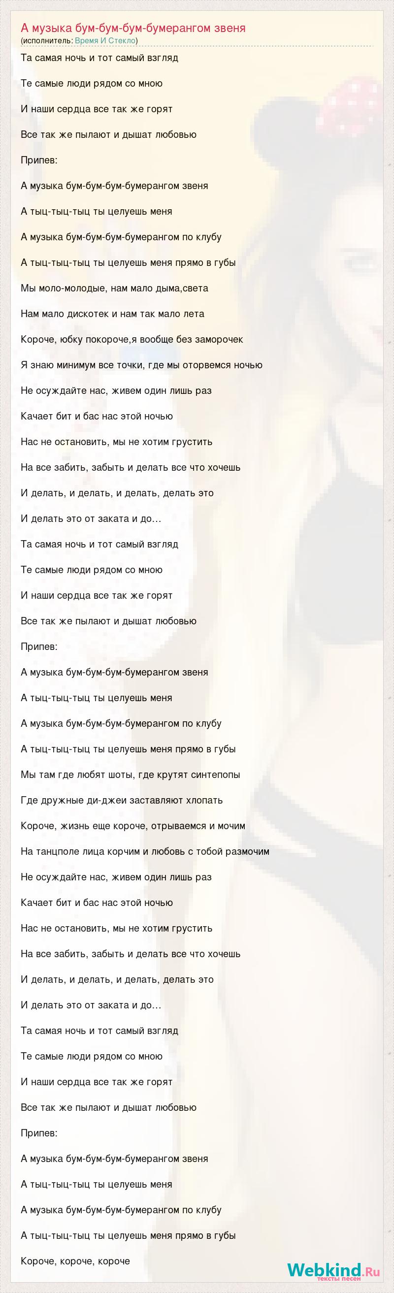 Та самая ночь и тот самый взгляд Те самые люди рядом со мною И наши сердца все так же горят Все так же пылают и дышат любовью Припев: А музыка бум-бум-бум-бумерангом звеня А тыц-тыц-тыц ты целуешь меня А музыка бум-бум-бум-бумерангом по клубу А тыц-тыц-тыц ты целуешь меня прямо в губы Мы моло-молодые, нам мало дыма,света Нам мало дискотек и нам так мало лета Короче, юбку покороче,я вообще без заморочек Я знаю минимум все точки, где мы оторвемся ночью Не осуждайте нас, живем один лишь раз Качает бит и бас нас этой ночью Нас не остановить, мы не хотим грустить На все забить, забыть и делать все что хочешь И делать, и делать, и делать, делать это И делать это от заката и до… Та самая ночь и тот самый взгляд Те самые люди рядом со мною И наши сердца все так же горят Все так же пылают и дышат любовью Припев: А музыка бум-бум-бум-бумерангом звеня А тыц-тыц-тыц ты целуешь меня А музыка бум-бум-бум-бумерангом по клубу А тыц-тыц-тыц ты целуешь меня прямо в губы Мы там где любят шоты, где крутят синтепопы Где дружные ди-джеи заставляют хлопать Короче, жизнь еще короче, отрываемся и мочим На танцполе лица корчим и любовь с тобой размочим Не осуждайте нас, живем один лишь раз Качает бит и бас нас этой ночью Нас не остановить, мы не хотим грустить На все забить, забыть и делать все что хочешь И делать, и делать, и делать, делать это И делать это от заката и до… Та самая ночь и тот самый взгляд Те самые люди рядом со мною И наши сердца все так же горят Все так же пылают и дышат любовью Припев: А музыка бум-бум-бум-бумерангом звеня А тыц-тыц-тыц ты целуешь меня А музыка бум-бум-бум-бумерангом по клубу А тыц-тыц-тыц ты целуешь меня прямо в губы Короче, короче, короче