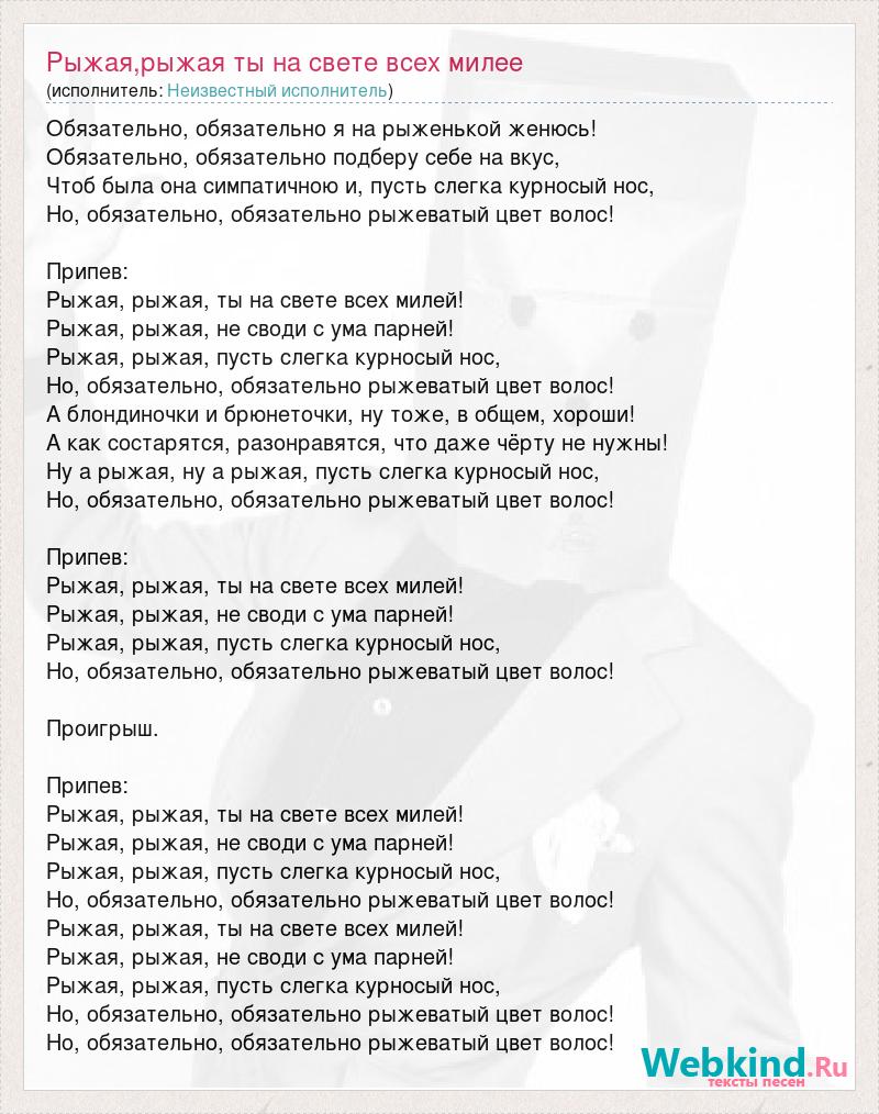 Обязательно, обязательно я на рыженькой женюсь! Обязательно, обязательно подберу себе на вкус, Чтоб была она симпатичною и, пусть слегка курносый нос, Но, обязательно, обязательно рыжеватый цвет волос! Припев: Рыжая, рыжая, ты на свете всех милей! Рыжая, рыжая, не своди с ума парней! Рыжая, рыжая, пусть слегка курносый нос, Но, обязательно, обязательно рыжеватый цвет волос! А блондиночки и брюнеточки, ну тоже, в общем, хороши! А как состарятся, разонравятся, что даже чёрту не нужны! Ну а рыжая, ну а рыжая, пусть слегка курносый нос, Но, обязательно, обязательно рыжеватый цвет волос! Припев: Рыжая, рыжая, ты на свете всех милей! Рыжая, рыжая, не своди с ума парней! Рыжая, рыжая, пусть слегка курносый нос, Но, обязательно, обязательно рыжеватый цвет волос! Проигрыш. Припев: Рыжая, рыжая, ты на свете всех милей! Рыжая, рыжая, не своди с ума парней! Рыжая, рыжая, пусть слегка курносый нос, Но, обязательно, обязательно рыжеватый цвет волос! Рыжая, рыжая, ты на свете всех милей! Рыжая, рыжая, не своди с ума парней! Рыжая, рыжая, пусть слегка курносый нос, Но, обязательно, обязательно рыжеватый цвет волос! Но, обязательно, обязательно рыжеватый цвет волос!