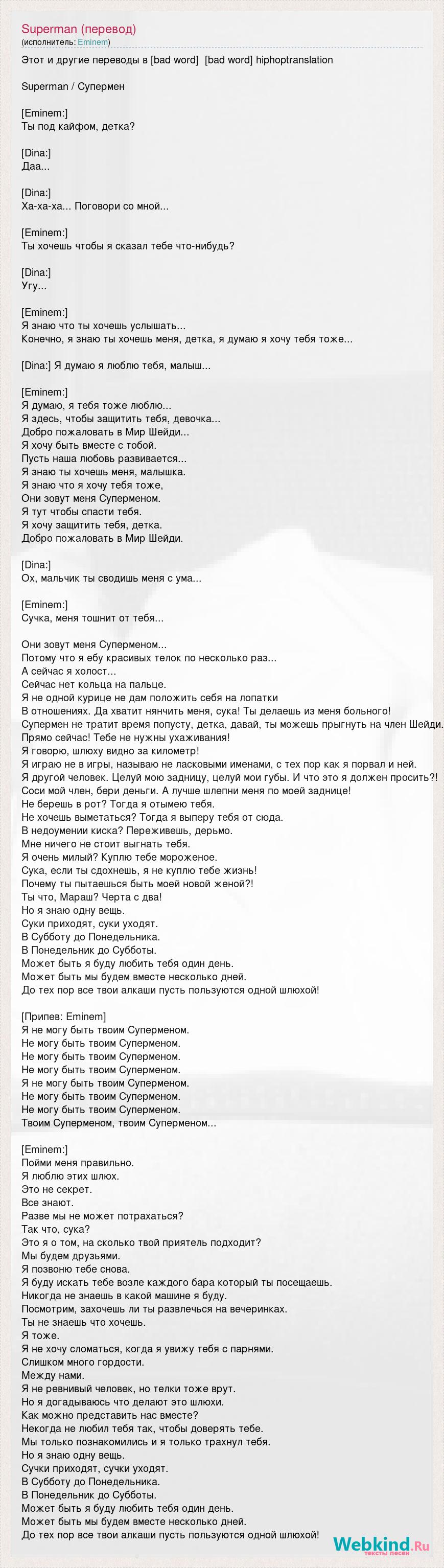 Этот и другие переводы в [bad word] [bad word] hiphoptranslation Superman / Супермен [Eminem:] Ты под кайфом, детка? [Dina:] Даа... [Dina:] Ха-ха-ха... Поговори со мной... [Eminem:] Ты хочешь чтобы я сказал тебе что-нибудь? [Dina:] Угу... [Eminem:] Я знаю что ты хочешь услышать... Конечно, я знаю ты хочешь меня, детка, я думаю я хочу тебя тоже... [Dina:] Я думаю я люблю тебя, малыш... [Eminem:] Я думаю, я тебя тоже люблю... Я здесь, чтобы защитить тебя, девочка... Добро пожаловать в Мир Шейди... Я хочу быть вместе с тобой. Пусть наша любовь развивается... Я знаю ты хочешь меня, малышка. Я знаю что я хочу тебя тоже, Они зовут меня Суперменом. Я тут чтобы спасти тебя. Я хочу защитить тебя, детка. Добро пожаловать в Мир Шейди. [Dina:] Ох, мальчик ты сводишь меня с ума... [Eminem:] Сучка, меня тошнит от тебя... Они зовут меня Суперменом... Потому что я ебу красивых телок по несколько раз... А сейчас я холост... Сейчас нет кольца на пальце. Я не одной курице не дам положить себя на лопатки В отношениях. Да хватит нянчить меня, сука! Ты делаешь из меня больного! Супермен не тратит время попусту, детка, давай, ты можешь прыгнуть на член Шейди. Прямо сейчас! Тебе не нужны ухаживания! Я говорю, шлюху видно за километр! Я играю не в игры, называю не ласковыми именами, с тех пор как я порвал и ней. Я другой человек. Целуй мою задницу, целуй мои губы. И что это я должен просить?! Соси мой член, бери деньги. А лучше шлепни меня по моей заднице! Не берешь в рот? Тогда я отымею тебя. Не хочешь выметаться? Тогда я выперу тебя от сюда. В недоумении киска? Переживешь, дерьмо. Мне ничего не стоит выгнать тебя. Я очень милый? Куплю тебе мороженое. Сука, если ты сдохнешь, я не куплю тебе жизнь! Почему ты пытаешься быть моей новой женой?! Ты что, Мараш? Черта с два! Но я знаю одну вещь. Суки приходят, суки уходят. В Субботу до Понедельника. В Понедельник до Субботы. Может быть я буду любить тебя один день. Может быть мы будем вместе несколько дней. До тех пор все твои алкаши пусть пользуются одной шлюхой! [Припев: Eminem] Я не могу быть твоим Суперменом. Не могу быть твоим Суперменом. Не могу быть твоим Суперменом. Не могу быть твоим Суперменом. Я не могу быть твоим Суперменом. Не могу быть твоим Суперменом. Не могу быть твоим Суперменом. Твоим Cуперменом, твоим Cуперменом... [Eminem:] Пойми меня правильно. Я люблю этих шлюх. Это не секрет. Все знают. Разве мы не может потрахаться? Так что, сука? Это я о том, на сколько твой приятель подходит? Мы будем друзьями. Я позвоню тебе снова. Я буду искать тебе возле каждого бара который ты посещаешь. Никогда не знаешь в какой машине я буду. Посмотрим, захочешь ли ты развлечься на вечеринках. Ты не знаешь что хочешь. Я тоже. Я не хочу сломаться, когда я увижу тебя с парнями. Слишком много гордости. Между нами. Я не ревнивый человек, но телки тоже врут. Но я догадываюсь что делают это шлюхи. Как можно представить нас вместе? Некогда не любил тебя так, чтобы доверять тебе. Мы только познакомились и я только трахнул тебя. Но я знаю одну вещь. Сучки приходят, сучки уходят. В Субботу до Понедельника. В Понедельник до Субботы. Может быть я буду любить тебя один день. Может быть мы будем вместе несколько дней. До тех пор все твои алкаши пусть пользуются одной шлюхой!