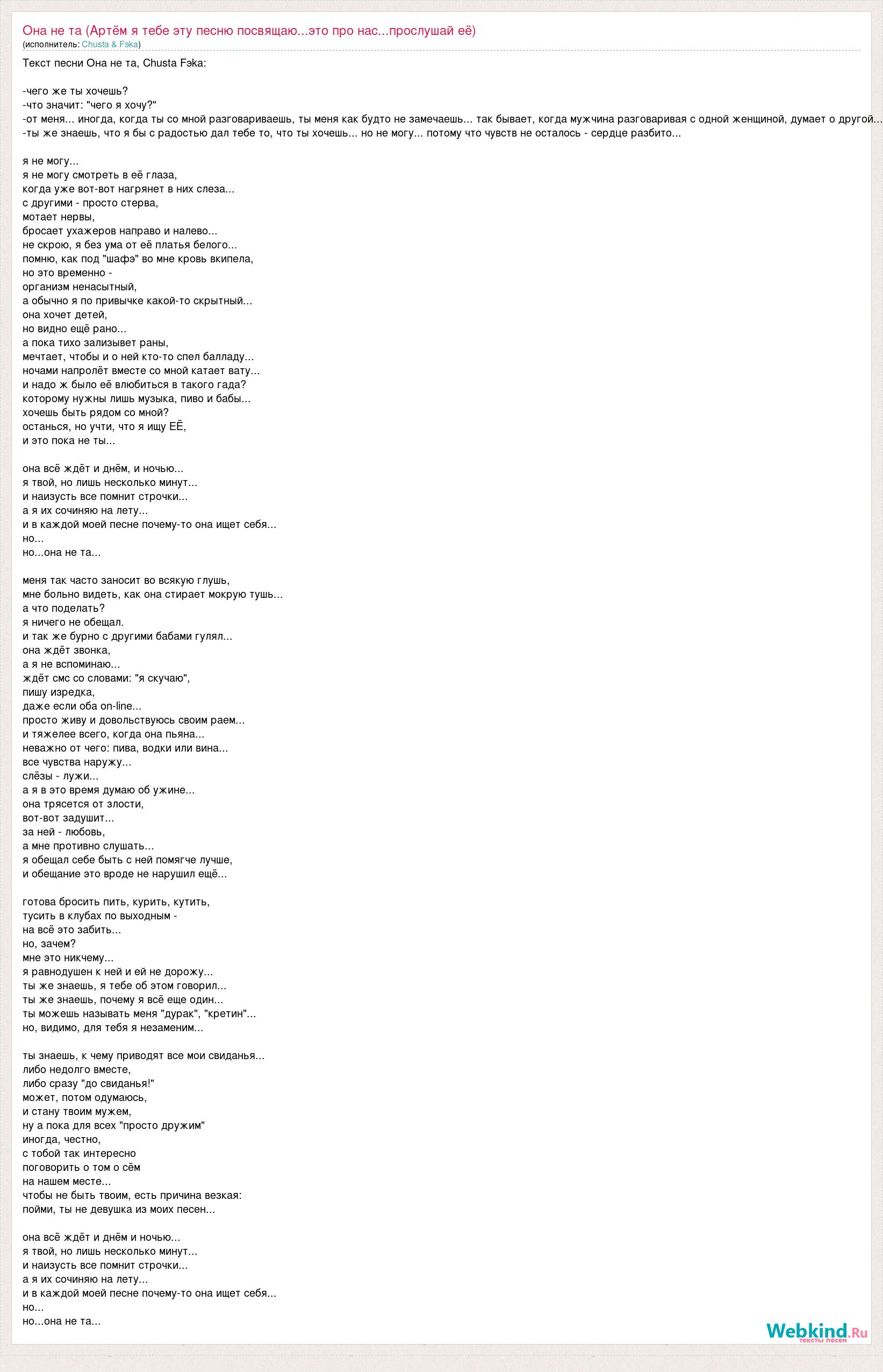 Главная→Исполнители→Chusta & Fэka→Она не та (Артём я тебе эту песню посвящаю...это про нас...прослушай её)