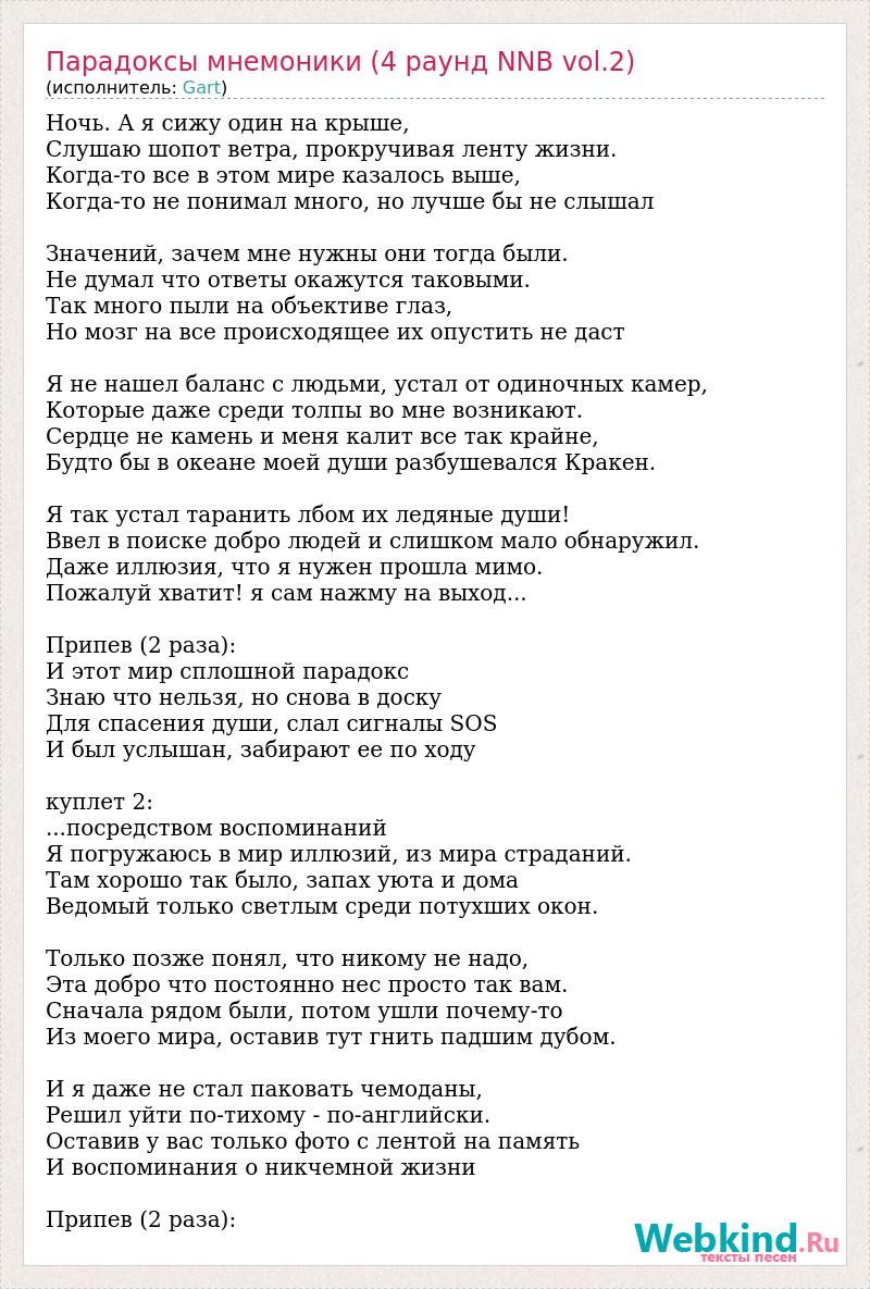 Ночь. А я сижу один на крыше, Cлушаю шопот ветра, прокручивая ленту жизни. Когда-то все в этом мире казалось выше, Когда-то не понимал много, но лучше бы не слышал Значений, зачем мне нужны они тогда были. Не думал что ответы окажутся таковыми. Так много пыли на объективе глаз, Но мозг на все происходящее их опустить не даст Я не нашел баланс с людьми, устал от одиночных камер, Которые даже среди толпы во мне возникают. Сердце не камень и меня калит все так крайне, Будто бы в океане моей души разбушевался Кракен. Я так устал таранить лбом их ледяные души! Ввел в поиске добро людей и слишком мало обнаружил. Даже иллюзия, что я нужен прошла мимо. Пожалуй хватит! я сам нажму на выход... Припев (2 раза): И этот мир сплошной парадокс Знаю что нельзя, но снова в доску Для спасения души, слал сигналы SOS И был услышан, забирают ее по ходу куплет 2: ...посредством воспоминаний Я погружаюсь в мир иллюзий, из мира страданий. Там хорошо так было, запах уюта и дома Ведомый только светлым среди потухших окон. Только позже понял, что никому не надо, Эта добро что постоянно нес просто так вам. Сначала рядом были, потом ушли почему-то Из моего мира, оставив тут гнить падшим дубом. И я даже не стал паковать чемоданы, Решил уйти по-тихому - по-английски. Оставив у вас только фото с лентой на память И воспоминания о никчемной жизни Припев (2 раза):