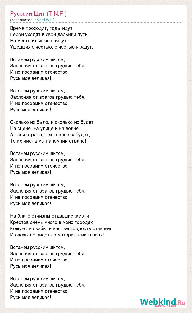 Время проходит, годы идут, Герои уходят в свой дальний путь. На место их иные грядут, Ушедших с честью, с честью и ждут. Встанем русским щитом, Заслоняя от врагов грудью тебя, И не посрамим отечество, Русь моя великая! Встанем русским щитом, Заслоняя от врагов грудью тебя, И не посрамим отечество, Русь моя великая! Сколько их было, и сколько их будет На сцене, на улице и на войне, А если страна, тех героев забудет, То их имена мы напомним стране! Встанем русским щитом, Заслоняя от врагов грудью тебя, И не посрамим отечество, Русь моя великая! Встанем русским щитом, Заслоняя от врагов грудью тебя, И не посрамим отечество, Русь моя великая! На благо отчизны отдавшие жизни Крестов очень много в моих городах Кощунство забыть вас, вы гордость отчизны, И слезы не видеть в материнских глазах! Встанем русским щитом, Заслоняя от врагов грудью тебя, И не посрамим отечество, Русь моя великая! Встанем русским щитом, Заслоняя от врагов грудью тебя, И не посрамим отечество, Русь моя великая!