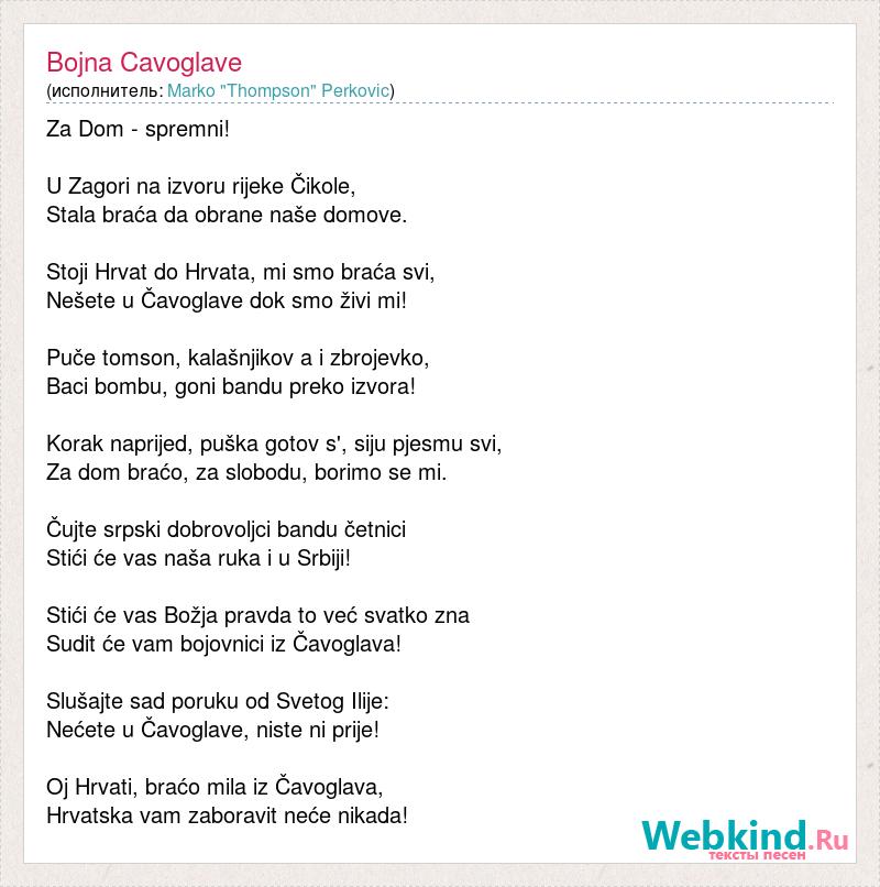 Za Dom - spremni! U Zagori na izvoru rijeke Čikole, Stala braća da obrane naše domove. Stoji Hrvat do Hrvata, mi smo braća svi, Nešete u Čavoglave dok smo živi mi! Puče tomson, kalašnjikov a i zbrojevko, Baci bombu, goni bandu preko izvora! Korak naprijed, puška gotov s', siju pjesmu svi, Za dom braćo, za slobodu, borimo se mi. Čujte srpski dobrovoljci bandu četnici Stići će vas naša ruka i u Srbiji! Stići će vas Božja pravda to već svatko zna Sudit će vam bojovnici iz Čavoglava! Slušajte sad poruku od Svetog Ilije: Nećete u Čavoglave, niste ni prije! Oj Hrvati, braćo mila iz Čavoglava, Hrvatska vam zaboravit neće nikada!