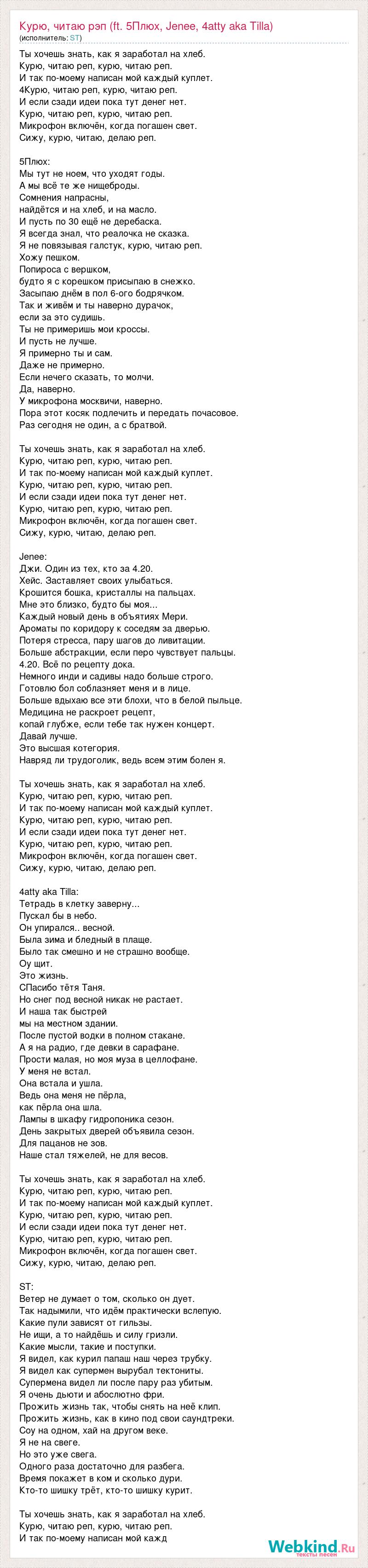 Ты хочешь знать, как я заработал на хлеб. Курю, читаю реп, курю, читаю реп. И так по-моему написан мой каждый куплет. 4Курю, читаю реп, курю, читаю реп. И если сзади идеи пока тут денег нет. Курю, читаю реп, курю, читаю реп. Микрофон включён, когда погашен свет. Сижу, курю, читаю, делаю реп. 5Плюх: Мы тут не ноем, что уходят годы. А мы всё те же нищеброды. Сомнения напрасны, найдётся и на хлеб, и на масло. И пусть по 30 ещё не деребаска. Я всегда знал, что реалочка не сказка. Я не повязывая галстук, курю, читаю реп. Хожу пешком. Попироса с вершком, будто я с корешком присыпаю в снежко. Засыпаю днём в пол 6-ого бодрячком. Так и живём и ты наверно дурачок, если за это судишь. Ты не примеришь мои кроссы. И пусть не лучше. Я примерно ты и сам. Даже не примерно. Если нечего сказать, то молчи. Да, наверно. У микрофона москвичи, наверно. Пора этот косяк подлечить и передать почасовое. Раз сегодня не один, а с братвой. Ты хочешь знать, как я заработал на хлеб. Курю, читаю реп, курю, читаю реп. И так по-моему написан мой каждый куплет. Курю, читаю реп, курю, читаю реп. И если сзади идеи пока тут денег нет. Курю, читаю реп, курю, читаю реп. Микрофон включён, когда погашен свет. Сижу, курю, читаю, делаю реп. Jenee: Джи. Один из тех, кто за 4.20. Хейс. Заставляет своих улыбаться. Крошится бошка, кристаллы на пальцах. Мне это близко, будто бы моя... Каждый новый день в объятиях Мери. Ароматы по коридору к соседям за дверью. Потеря стресса, пару шагов до ливитации. Больше абстракции, если перо чувствует пальцы. 4.20. Всё по рецепту дока. Немного инди и садивы надо больше строго. Готовлю бол соблазняет меня и в лице. Больше вдыхаю все эти блохи, что в белой пыльце. Медицина не раскроет рецепт, копай глубже, если тебе так нужен концерт. Давай лучше. Это высшая котегория. Навряд ли трудоголик, ведь всем этим болен я. Ты хочешь знать, как я заработал на хлеб. Курю, читаю реп, курю, читаю реп. И так по-моему написан мой каждый куплет. Курю, читаю реп, курю, читаю реп. И если сзади идеи пока тут денег нет. Курю, читаю реп, курю, читаю реп. Микрофон включён, когда погашен свет. Сижу, курю, читаю, делаю реп. 4atty aka Tilla: Тетрадь в клетку заверну... Пускал бы в небо. Он упирался.. весной. Была зима и бледный в плаще. Было так смешно и не страшно вообще. Оу щит. Это жизнь. СПасибо тётя Таня. Но снег под весной никак не растает. И наша так быстрей мы на местном здании. После пустой водки в полном стакане. А я на радио, где девки в сарафане. Прости малая, но моя муза в целлофане. У меня не встал. Она встала и ушла. Ведь она меня не пёрла, как пёрла она шла. Лампы в шкафу гидропоника сезон. День закрытых дверей объявила сезон. Для пацанов не зов. Наше стал тяжелей, не для весов. Ты хочешь знать, как я заработал на хлеб. Курю, читаю реп, курю, читаю реп. И так по-моему написан мой каждый куплет. Курю, читаю реп, курю, читаю реп. И если сзади идеи пока тут денег нет. Курю, читаю реп, курю, читаю реп. Микрофон включён, когда погашен свет. Сижу, курю, читаю, делаю реп. ST: Ветер не думает о том, сколько он дует. Так надымили, что идём практически вслепую. Какие пули зависят от гильзы. Не ищи, а то найдёшь и силу гризли. Какие мысли, такие и поступки. Я видел, как курил папаш наш через трубку. Я видел как супермен вырубал тектониты. Супермена видел ли после пару раз убитым. Я очень дьюти и абослютно фри. Прожить жизнь так, чтобы снять на неё клип. Прожить жизнь, как в кино под свои с