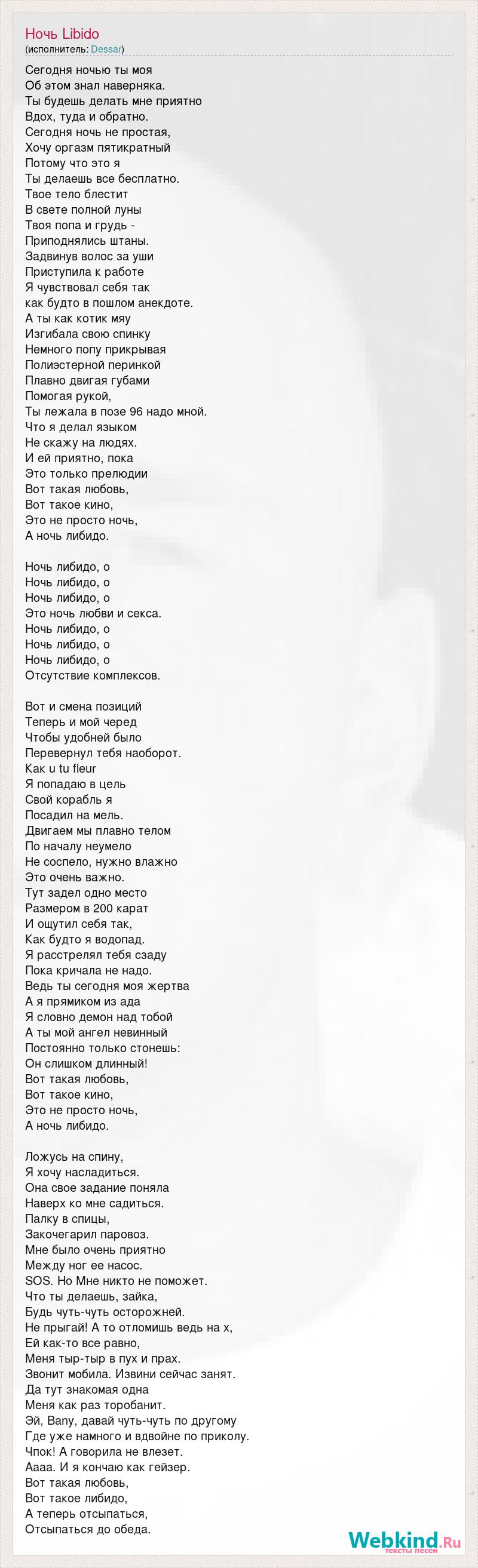 Сегодня ночью ты моя Об этом знал наверняка. Ты будешь делать мне приятно Вдох, туда и обратно. Сегодня ночь не простая, Хочу оргазм пятикратный Потому что это я Ты делаешь все бесплатно. Твое тело блестит В свете полной луны Твоя попа и грудь - Приподнялись штаны. Задвинув волос за уши Приступила к работе Я чувствовал себя так как будто в пошлом анекдоте. А ты как котик мяу Изгибала свою спинку Немного попу прикрывая Полиэстерной перинкой Плавно двигая губами Помогая рукой, Ты лежала в позе 96 надо мной. Что я делал языком Не скажу на людях. И ей приятно, пока Это только прелюдии Вот такая любовь, Вот такое кино, Это не просто ночь, А ночь либидо. Ночь либидо, о Ночь либидо, о Ночь либидо, о Это ночь любви и секса. Ночь либидо, о Ночь либидо, о Ночь либидо, о Отсутствие комплексов. Вот и смена позиций Теперь и мой черед Чтобы удобней было Перевернул тебя наоборот. Как u tu fleur Я попадаю в цель Свой корабль я Посадил на мель. Двигаем мы плавно телом По началу неумело Не соспело, нужно влажно Это очень важно. Тут задел одно место Размером в 200 карат И ощутил себя так, Как будто я водопад. Я расстрелял тебя сзаду Пока кричала не надо. Ведь ты сегодня моя жертва А я прямиком из ада Я словно демон над тобой А ты мой ангел невинный Постоянно только стонешь: Он слишком длинный! Вот такая любовь, Вот такое кино, Это не просто ночь, А ночь либидо. Ложусь на спину, Я хочу насладиться. Она свое задание поняла Наверх ко мне садиться. Палку в спицы, Закочегарил паровоз. Мне было очень приятно Между ног ее насос. SOS. Но Мне никто не поможет. Что ты делаешь, зайка, Будь чуть-чуть осторожней. Не прыгай! А то отломишь ведь на х, Ей как-то все равно, Меня тыр-тыр в пух и прах. Звонит мобила. Извини сейчас занят. Да тут знакомая одна Меня как раз торобанит. Эй, Bany, давай чуть-чуть по другому Где уже намного и вдвойне по приколу. Чпок! А говорила не влезет. Аааа. И я кончаю как гейзер. Вот такая любовь, Вот такое либидо, А теперь отсыпаться, Отсыпаться до обеда.