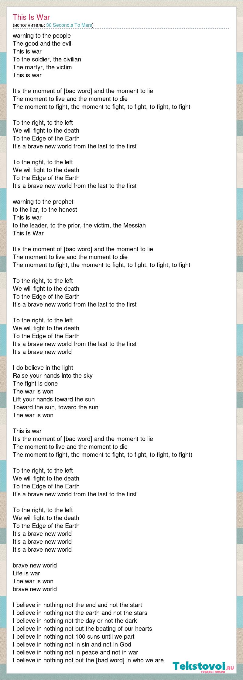 warning to the people The good and the evil This is war To the soldier, the civilian The martyr, the victim This is war It's the moment of truth and the moment to lie The moment to live and the moment to die The moment to fight, the moment to fight, to fight, to fight, to fight To the right, to the left We will fight to the death To the Edge of the Earth It's a brave new world from the last to the first To the right, to the left We will fight to the death To the Edge of the Earth It's a brave new world from the last to the first warning to the prophet to the liar, to the honest This is war to the leader, to the prior, the victim, the Messiah This Is War It's the moment of truth and the moment to lie The moment to live and the moment to die The moment to fight, the moment to fight, to fight, to fight, to fight To the right, to the left We will fight to the death To the Edge of the Earth It's a brave new world from the last to the first To the right, to the left We will fight to the death To the Edge of the Earth It's a brave new world from the last to the first It's a brave new world I do believe in the light Raise your hands into the sky The fight is done The war is won Lift your hands toward the sun Toward the sun, toward the sun The war is won This is war It's the moment of truth and the moment to lie The moment to live and the moment to die The moment to fight, the moment to fight, to fight, to fight, to fight) To the right, to the left We will fight to the death To the Edge of the Earth It's a brave new world from the last to the first To the right, to the left We will fight to the death To the Edge of the Earth It's a brave new world It's a brave new world It's a brave new world brave new world Life is war The war is won brave new world I believe in nothing not the end and not the start I believe in nothing not the earth and not the stars I believe in nothing not the day or not the dark I believe in nothing not but the beating of our hearts I believe in nothing not 100 suns until we part I believe in nothing not in sin and not in God I believe in nothing not in peace and not in war I believe in nothing not but the truth in who we are