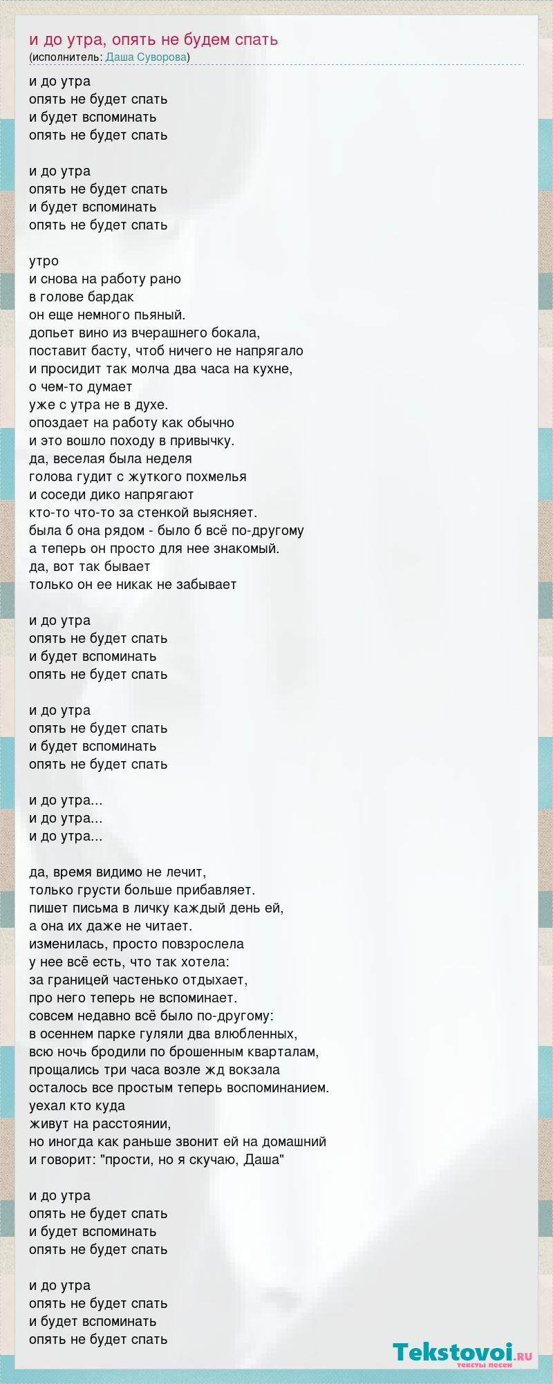 и до утра опять не будет спать и будет вспоминать опять не будет спать и до утра опять не будет спать и будет вспоминать опять не будет спать утро и снова на работу рано в голове бардак он еще немного пьяный. допьет вино из вчерашнего бокала, поставит басту, чтоб ничего не напрягало и просидит так молча два часа на кухне, о чем-то думает уже с утра не в духе. опоздает на работу как обычно и это вошло походу в привычку. да, веселая была неделя голова гудит с жуткого похмелья и соседи дико напрягают кто-то что-то за стенкой выясняет. была б она рядом - было б всё по-другому а теперь он просто для нее знакомый. да, вот так бывает только он ее никак не забывает и до утра опять не будет спать и будет вспоминать опять не будет спать и до утра опять не будет спать и будет вспоминать опять не будет спать и до утра... и до утра... и до утра... да, время видимо не лечит, только грусти больше прибавляет. пишет письма в личку каждый день ей, а она их даже не читает. изменилась, просто повзрослела у нее всё есть, что так хотела: за границей частенько отдыхает, про него теперь не вспоминает. совсем недавно всё было по-другому: в осеннем парке гуляли два влюбленных, всю ночь бродили по брошенным кварталам, прощались три часа возле жд вокзала осталось все простым теперь воспоминанием. уехал кто куда живут на расстоянии, но иногда как раньше звонит ей на домашний и говорит: "прости, но я скучаю, Даша" и до утра опять не будет спать и будет вспоминать опять не будет спать и до утра опять не будет спать и будет вспоминать опять не будет спать