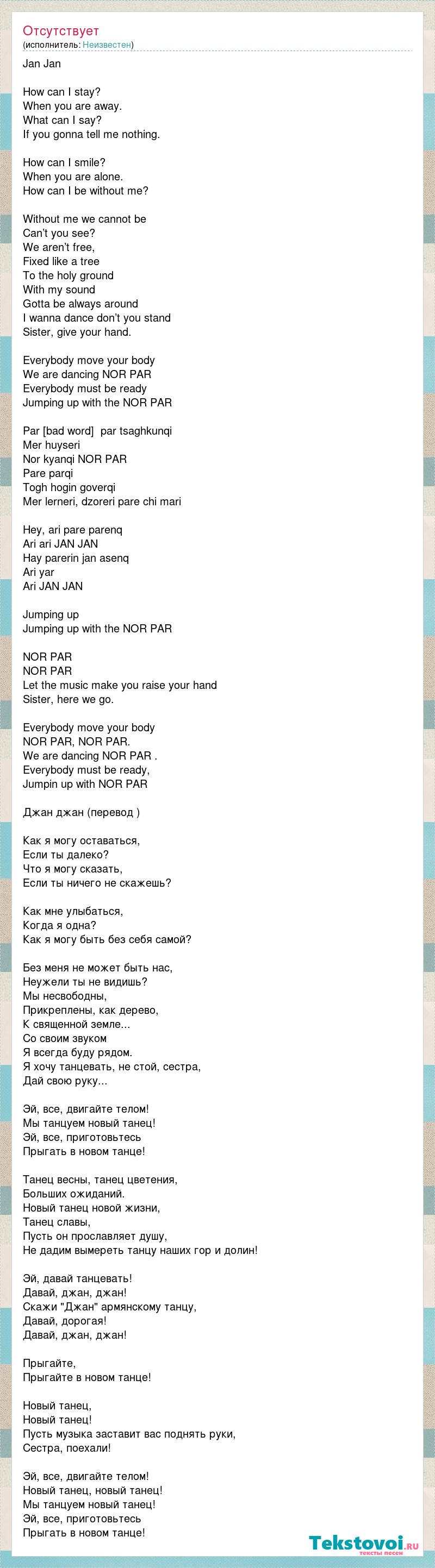 Jan Jan How can I stay? When you are away. What can I say? If you gonna tell me nothing. How can I smile? When you are alone. How can I be without me? Without me we cannot be Can’t you see? We aren’t free, Fixed like a tree To the holy ground With my sound Gotta be always around I wanna dance don’t you stand Sister, give your hand. Everybody move your body We are dancing NOR PAR Everybody must be ready Jumping up with the NOR PAR Par garunqi, par tsaghkunqi Mer huyseri Nor kyanqi NOR PAR Pare parqi Togh hogin goverqi Mer lerneri, dzoreri pare chi mari Hey, ari pare parenq Ari ari JAN JAN Hay parerin jan asenq Ari yar Ari JAN JAN Jumping up Jumping up with the NOR PAR NOR PAR NOR PAR Let the music make you raise your hand Sister, here we go. Everybody move your body NOR PAR, NOR PAR. We are dancing NOR PAR . Everybody must be ready, Jumpin up with NOR PAR Джан джан (перевод ) Как я могу оставаться, Если ты далеко? Что я могу сказать, Если ты ничего не скажешь? Как мне улыбаться, Когда я одна? Как я могу быть без себя самой? Без меня не может быть нас, Неужели ты не видишь? Мы несвободны, Прикреплены, как дерево, К священной земле... Со своим звуком Я всегда буду рядом. Я хочу танцевать, не стой, сестра, Дай свою руку... Эй, все, двигайте телом! Мы танцуем новый танец! Эй, все, приготовьтесь Прыгать в новом танце! Танец весны, танец цветения, Больших ожиданий. Новый танец новой жизни, Танец славы, Пусть он прославляет душу, Не дадим вымереть танцу наших гор и долин! Эй, давай танцевать! Давай, джан, джан! Скажи "Джан" армянскому танцу, Давай, дорогая! Давай, джан, джан! Прыгайте, Прыгайте в новом танце! Новый танец, Новый танец! Пусть музыка заставит вас поднять руки, Сестра, поехали! Эй, все, двигайте телом! Новый танец, новый танец! Мы танцуем новый танец! Эй, все, приготовьтесь Прыгать в новом танце!