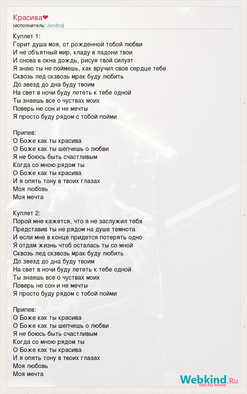 Куплет 1: Горит душа моя, от рожденной тобой любви И не объятный мир, кладу в ладони твои И снова в окна дождь, рисуя твой силуэт Я знаю ты не поймешь, как вручил свое сердце тебе Сквозь лед скзвозь мрак буду любить До звезд до дна буду твоим На свет в ночи буду лететь к тебе одной Ты знаешь все о чуствах моих Поверь не сон и не мечты Я просто буду рядом с тобой пойми Припев: О Боже как ты красива О Боже как ты шепчешь о любви Я не боюсь быть счастливым Когда со мною рядом ты О Боже как ты красива И я опять тону в твоих глазах Моя любовь Моя мечта Куплет 2: Порой мне кажется, что я не заслужил тебя Представив ты не рядом на душе темнота И если мне в конце придется потерять одно Я отдам жизнь чтоб осталась ты со мной Сквозь лед скзвозь мрак буду любить До звезд до дна буду твоим На свет в ночи буду лететь к тебе одной Ты знаешь все о чуствах моих Поверь не сон и не мечты Я просто буду рядом с тобой пойми Припев: О Боже как ты красива О Боже как ты шепчешь о любви Я не боюсь быть счастливым Когда со мною рядом ты О Боже как ты красива И я опять тону в твоих глазах Моя любовь Моя мечта