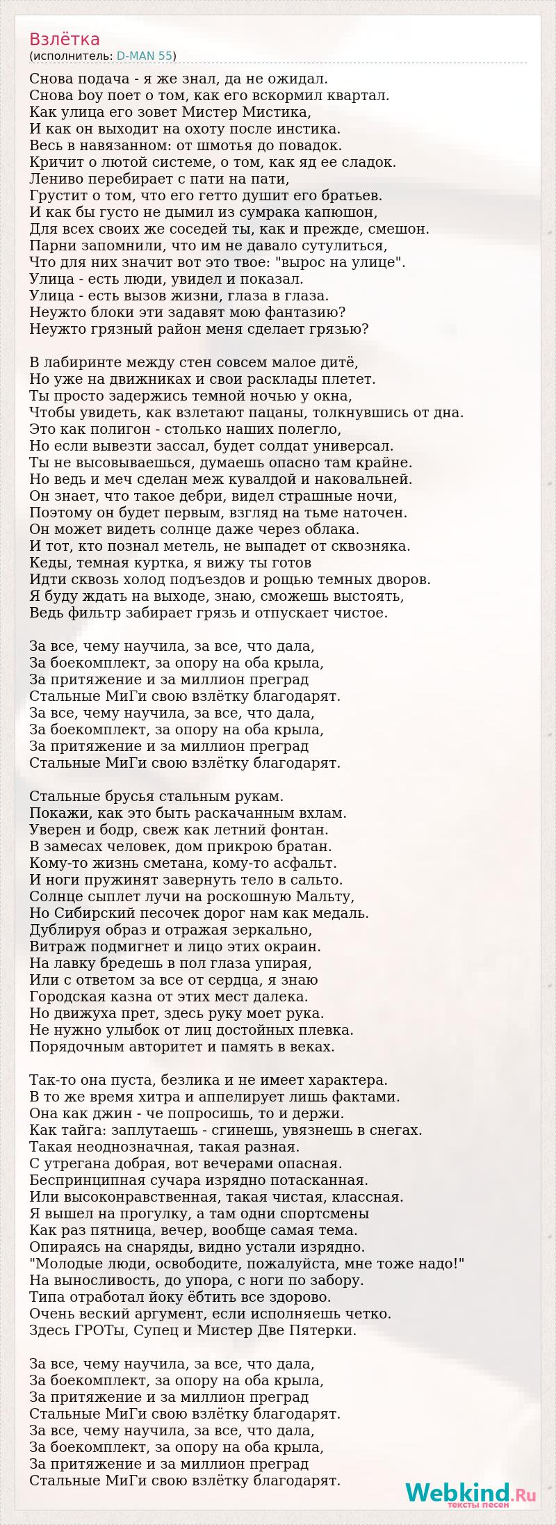 Снова подача - я же знал, да не ожидал. Снова boy поет о том, как его вскормил квартал. Как улица его зовет Мистер Мистика, И как он выходит на охоту после инстика. Весь в навязанном: от шмотья до повадок. Кричит о лютой системе, о том, как яд ее сладок. Лениво перебирает с пати на пати, Грустит о том, что его гетто душит его братьев. И как бы густо не дымил из сумрака капюшон, Для всех своих же соседей ты, как и прежде, смешон. Парни запомнили, что им не давало сутулиться, Что для них значит вот это твое: "вырос на улице". Улица - есть люди, увидел и показал. Улица - есть вызов жизни, глаза в глаза. Неужто блоки эти задавят мою фантазию? Неужто грязный район меня сделает грязью? В лабиринте между стен совсем малое дитё, Но уже на движниках и свои расклады плетет. Ты просто задержись темной ночью у окна, Чтобы увидеть, как взлетают пацаны, толкнувшись от дна. Это как полигон - столько наших полегло, Но если вывезти зассал, будет солдат универсал. Ты не высовываешься, думаешь опасно там крайне. Но ведь и меч сделан меж кувалдой и наковальней. Он знает, что такое дебри, видел страшные ночи, Поэтому он будет первым, взгляд на тьме наточен. Он может видеть солнце даже через облака. И тот, кто познал метель, не выпадет от сквозняка. Кеды, темная куртка, я вижу ты готов Идти сквозь холод подъездов и рощью темных дворов. Я буду ждать на выходе, знаю, сможешь выстоять, Ведь фильтр забирает грязь и отпускает чистое. За все, чему научила, за все, что дала, За боекомплект, за опору на оба крыла, За притяжение и за миллион преград Стальные МиГи свою взлётку благодарят. За все, чему научила, за все, что дала, За боекомплект, за опору на оба крыла, За притяжение и за миллион преград Стальные МиГи свою взлётку благодарят. Стальные брусья стальным рукам. Покажи, как это быть раскачанным вхлам. Уверен и бодр, свеж как летний фонтан. В замесах человек, дом прикрою братан. Кому-то жизнь сметана, кому-то асфальт. И ноги пружинят завернуть тело в сальто. Солнце сыплет лучи на роскошную Мальту, Но Сибирский песочек дорог нам как медаль. Дублируя образ и отражая зеркально, Витраж подмигнет и лицо этих окраин. На лавку бредешь в пол глаза упирая, Или с ответом за все от сердца, я знаю Городская казна от этих мест далека. Но движуха прет, здесь руку моет рука. Не нужно улыбок от лиц достойных плевка. Порядочным авторитет и память в веках. Так-то она пуста, безлика и не имеет характера. В то же время хитра и аппелирует лишь фактами. Она как джин - че попросишь, то и держи. Как тайга: заплутаешь - сгинешь, увязнешь в снегах. Такая неоднозначная, такая разная. С утрегана добрая, вот вечерами опасная. Беспринципная сучара изрядно потасканная. Или высоконравственная, такая чистая, классная. Я вышел на прогулку, а там одни спортсмены Как раз пятница, вечер, вообще самая тема. Опираясь на снаряды, видно устали изрядно. "Молодые люди, освободите, пожалуйста, мне тоже надо!" На выносливость, до упора, с ноги по забору. Типа отработал йоку ёбтить все здорово. Очень веский аргумент, если исполняешь четко. Здесь ГРОТы, Супец и Мистер Две Пятерки. За все, чему научила, за все, что дала, За боекомплект, за опору на оба крыла, За притяжение и за миллион преград Стальные МиГи свою взлётку благодарят. За все, чему научила, за все, что дала, За боекомплект, за опору на оба крыла, За притяжение и за миллион преград Стальные МиГи свою взлёт