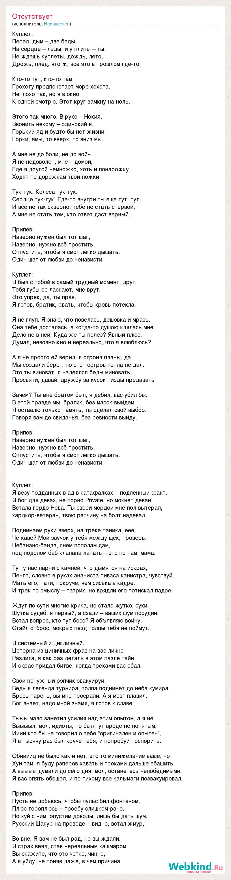 Куплет: Пепел, дым – две беды. На сердце – льды, и у плиты – ты. Не ждешь куплеты, дождь, лето, Дрожь, плед, что ж, всё это в прошлом где-то. Кто-то тут, кто-то там Грохоту предпочетает море хохота. Неплохо так, но я в окно К одной смотрю. Этот круг замкну на ноль. Этого так много. В руке – Нокия, Звонить некому – одинокий я. Горький яд и будто бы нет жизни. Горки, ямы, то вверх, то вниз мы. А мне не до боли, не до войн. Я не недоволен, мне – домой, Где я другой немножко, хоть и понарожку. Ходят по дорожкам твои ножки Тук-тук. Колеса тук-тук. Сердце тук-тук. Где-то внутри ты еще тут, тут. И всё не так скверно, тебе не стать стервой, А мне не стать тем, кто ответ даст верный. Припев: Наверно нужен был тот шаг, Наверно, нужно всё простить, Отпустить, чтобы я смог легко дышать. Один шаг от любви до ненависти. Куплет: Я был с тобой в самый трудный момент, друг. Тебя губы ее ласкают, мне врут. Это упрек, да, ты прав. Я готов, братик, рвать, чтобы кровь потекла. Я не глуп. Я знаю, что повелась, дешовка и мразь. Она тебе досталась, а когда-то душою клялась мне. Дело не в ней. Куда же ты полез? Явный плюс, Думал, невозможно и нереально, что я влюблюсь? А я не просто ей верил, я строил планы, да. Мы создали берег, но этот остров тепла не дал. Это ты виноват, я надеялся беды миновать, Просвяти, давай, дружбу за кусок пизды предавать Зачем? Ты мне братом был, я дебил, вас убил бы. В этой правде мы, братик, без масок выйдем. Я оставлю только память, ты сделал свой выбор. Говоря вам до свиданья, без ревности выйду. Припев: Наверно нужен был тот шаг, Наверно, нужно всё простить, Отпустить, чтобы я смог легко дышать. Один шаг от любви до ненависти. ______________________________________________________________ Куплет: Я везу подданных в ад в катафалках – подленный факт. Я бог для девах, не порно Private, но мокнет деван. Встала гордо Нева. Ты своей мордой мне пол вытерал, хардкор-ветеран, твою рэпчину на болт надевал. Поднимаем руки вверх, на треке паника, еее, Че-каве? Мой звучок у тебя между щёк, проверь. Небанано-банда, гнем пополам дам, под подолом баб клапана лапать – это по нам, мама. Тут у нас парни с камней, что дымятся на искрах, Пенят, словно в руках ананиста пиваса канистра, чувствуй. Мать его, пати, покруче, чем сиська в кадре. И трек по смыслу – патрик, но врядли его потискал падре. Ждут по сути многие крика, но стало жутко, суки. Шутка судеб: я первый, а сзади – ваших шум посудин. Встал вопрос, кто тут босс? Я объявляю войну. Стайл отброс, мокрых пёзд толпы тебя не поймут. Я системный и цикличный. Цетерна из циничных фраз на вас лично Разлита, я как раз деталь в этом пазле тайн И окрас придал битве, когда треками вас ебал. Свой ненужный рэпчик эвакуируй, Ведь я легенда турнира, толпа поднимет до неба кумира. Брось парень, вы мне просрали. А я мозг плавил. Бог знает, надо мной знамя, я готов к славе. Тыыы мало заметил усилия над этим опытом, а я не Выыыыл, мол, идиоты, но был тут вроде не понятым. Ииии кто бы не говорил о тебе “оригинален и опытен”, Я в тысячу раз был круче тебя, и попробуй поспорить. Обиииид не было как и нет, это то минижелание ваше, но Хуй там, я буду рэперов хавать и треками дальше ебашить. А выыыы думали до сего дня, мол, останетесь непобедимыми, Я вас опять обошел, и по-тихому все калымаги поэвакуировал. Припев: Пусть не добьюсь, чтобы пульс бил фонтаном, Плюс тороплюсь – проебу слишком рано. Но хуй с ним, опустим доводы, лишь бы дать шум. Р