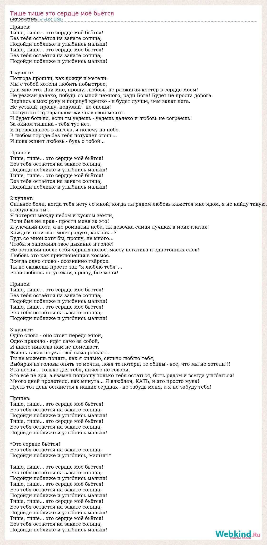 Припев: Тише, тише... это сердце моё бьётся! Без тебя остаётся на закате солнца, Подойди поближе и улыбнись малыш! Тише, тише... это сердце моё бьётся! Без тебя остаётся на закате солнца, Подойди поближе и улыбнись малыш! 1 куплет: Полгода прошли, как дожди и метели. Мы с тобой хотели любить побыстрее, Дай мне это. Дай мне, прошу, любовь, не разжигая костёр в сердце моём! Не уезжай далеко, побудь со мной немного, ради Бога! Будет не проста дорога. Вцепись в мою руку и поцелуй крепко - и будет лучше, чем закат лета. Не уезжай, прошу, подумай - не спеши! Из пустоты превращаем жизнь в свои мечты. И будет больно, если ты уедешь - уедешь далеко и любовь не согреешь! За окном тишина - тебя тут нет, Я превращаюсь в ангела, я полечу на небо. В любом городе без тебя потухнет огонь... И пока живет любовь - будь с тобой... Припев: Тише, тише... это сердце моё бьётся! Без тебя остаётся на закате солнца, Подойди поближе и улыбнись малыш! Тише, тише... это сердце моё бьётся! Без тебя остаётся на закате солнца, Подойди поближе и улыбнись малыш! 2 куплет: Сильнее боли, когда тебя нету со мной, когда ты рядом любовь кажется мне ядом, я не найду такую, вторую как ты... Я потерян между небом и куском земли, Если был не прав - прости меня за это! Я улечный поэт, а не романтик неба, ты девочка самая лучшая в моих глазах! Каждый твой шаг меня радует, как так...? Будь со мной хотя бы, прошу, не много... Чтобы я запомнил твоё дыхание и голос! Не оставляй после себя чёрных полос, массу негатива и однотонных слов! Любовь это как приключения в космос. Всегда одно слово - осознанно твёрдое. Ты не скажешь просто так "я люблю тебя"... Если любишь не уезжай, прошу, без меня! Припев: Тише, тише... это сердце моё бьётся! Без тебя остаётся на закате солнца, Подойди поближе и улыбнись малыш! Тише, тише... это сердце моё бьётся! Без тебя остаётся на закате солнца, Подойди поближе и улыбнись малыш! 3 куплет: Одно слово - оно стоит передо мной, Одно правило - идёт само за собой, И никто никогда нам не помешает, Жизнь такая штука - всё сама решает... Ты не можешь понять, как я сильно, сильно люблю тебя, Выбирая из головы опять те мечты, ловя те потери, те обиды - всё, что мы не хотели!!! Эта песня... только для тебя, ничего не говори, Это всё не зря, а взамен попрошу только тебя остаться, быть рядом и всегда улыбаться! Много дней пролетело, как минута... Я влюблен, КАТЬ, и это просто мука! Пусть тот день останется в наших сердцах - не забудь меня, а я не забуду тебя! Припев: Тише, тише... это сердце моё бьётся! Без тебя остаётся на закате солнца, Подойди поближе и улыбнись малыш! Тише, тише... это сердце моё бьётся! Без тебя остаётся на закате солнца, Подойди поближе и улыбнись малыш! *Это сердце бьётся! Без тебя остаётся на закате солнца, Подойди поближе и улыбнись, малыш!* Тише, тише... это сердце моё бьётся! Без тебя остаётся на закате солнца, Подойди поближе и улыбнись малыш! Тише, тише... это сердце моё бьётся! Без тебя остаётся на закате солнца, Подойди поближе и улыбнись малыш! Тише, тише... это сердце моё бьётся! Без тебя остаётся на закате солнца, Подойди поближе и улыбнись малыш! Тише, тише... это сердце моё бьётся! Без тебя остаётся на закате солнца, Подойди поближе и улыбнись малыш!