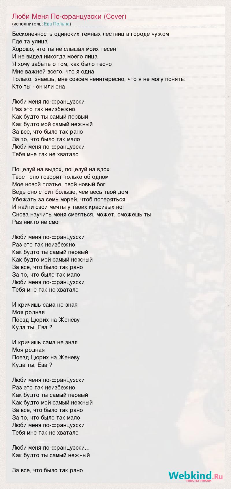 Бесконечность одиноких темных лестниц в городе чужом Где та улица Хорошо, что ты не слышал моих песен И не видел никогда моего лица Я хочу забыть о том, как было тесно Мне важней всего, что я одна Только, знаешь, мне совсем неинтересно, что я не могу понять: Кто ты - он или она Люби меня по-французски Раз это так неизбежно Как будто ты самый первый Как будто мой самый нежный За все, что было так рано За то, что было так мало Люби меня по-французски Тебя мне так не хватало Поцелуй на выдох, поцелуй на вдох Твое тело говорит только об одном Мое новой платье, твой новый бог Ведь оно стоит больше, чем весь твой дом Убежать за семь морей, чтоб потеряться И найти свои мечты у твоих красивых ног Снова научить меня смеяться, может, сможешь ты Раз никто не смог Люби меня по-французски Раз это так неизбежно Как будто ты самый первый Как будто мой самый нежный За все, что было так рано За то, что было так мало Люби меня по-французски Тебя мне так не хватало И кричишь сама не зная Моя родная Поезд Цюрих на Женеву Куда ты, Ева ? И кричишь сама не зная Моя родная Поезд Цюрих на Женеву Куда ты, Ева ? Люби меня по-французски Раз это так неизбежно Как будто ты самый первый Как будто мой самый нежный За все, что было так рано За то, что было так мало Люби меня по-французски Тебя мне так не хватало Люби меня по-французски... Как будто ты самый нежный За все, что было так рано