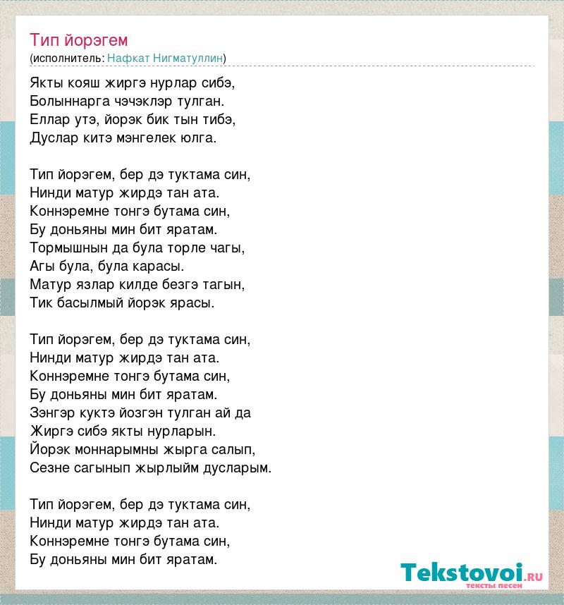 Якты кояш жиргэ нурлар сибэ, Болыннарга чэчэклэр тулган. Еллар утэ, йорэк бик тын тибэ, Дуслар китэ мэнгелек юлга. Тип йорэгем, бер дэ туктама син, Нинди матур жирдэ тан ата. Коннэремне тонгэ бутама син, Бу доньяны мин бит яратам. Тормышнын да була торле чагы, Агы була, була карасы. Матур язлар килде безгэ тагын, Тик басылмый йорэк ярасы. Тип йорэгем, бер дэ туктама син, Нинди матур жирдэ тан ата. Коннэремне тонгэ бутама син, Бу доньяны мин бит яратам. Зэнгэр куктэ йозгэн тулган ай да Жиргэ сибэ якты нурларын. Йорэк моннарымны жырга салып, Сезне сагынып жырлыйм дусларым. Тип йорэгем, бер дэ туктама син, Нинди матур жирдэ тан ата. Коннэремне тонгэ бутама син, Бу доньяны мин бит яратам.