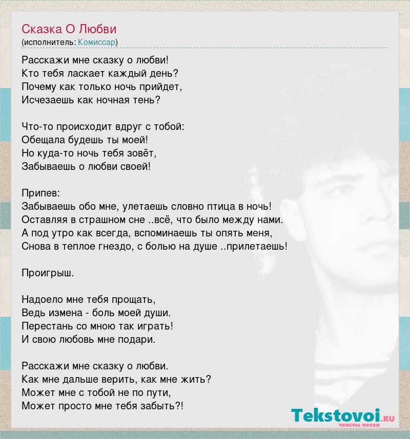 Расскажи мне сказку о любви! Кто тебя ласкает каждый день? Почему как только ночь прийдет, Исчезаешь как ночная тень? Что-то происходит вдруг с тобой: Обещала будешь ты моей! Но куда-то ночь тебя зовёт, Забываешь о любви своей! Припев: Забываешь обо мне, улетаешь словно птица в ночь! Оставляя в страшном сне ..всё, что было между нами. А под утро как всегда, вспоминаешь ты опять меня, Снова в теплое гнездо, с болью на душе ..прилетаешь! Проигрыш. Надоело мне тебя прощать, Ведь измена - боль моей души. Перестань со мною так играть! И свою любовь мне подари. Расскажи мне сказку о любви. Как мне дальше верить, как мне жить? Может мне с тобой не по пути, Может просто мне тебя забыть?!