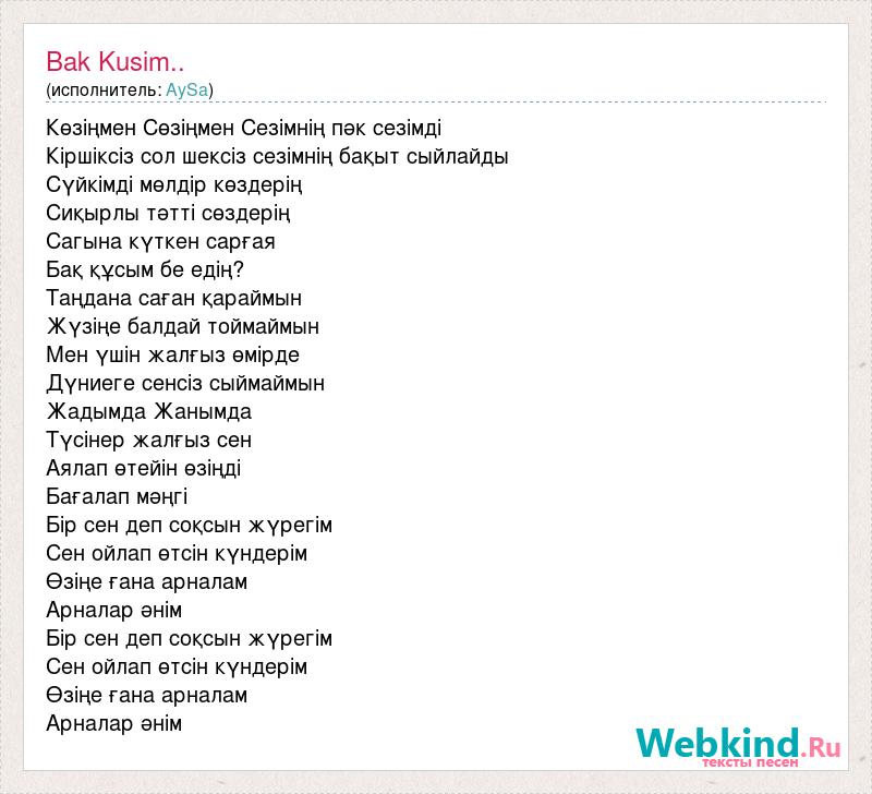 Көзіңмен Сөзіңмен Сезімнің пәк сезімді Кіршіксіз сол шексіз сезімнің бақыт сыйлайды Сүйкімді мөлдір көздерің Сиқырлы тәтті сөздерің Сагына күткен сарғая Бақ құсым бе едің? Таңдана саған қараймын Жүзіңе балдай тоймаймын Мен үшін жалғыз өмірде Дүниеге сенсіз сыймаймын Жадымда Жанымда Түсінер жалғыз сен Аялап өтейін өзіңді Бағалап мәңгі Бір сен деп соқсын жүрегім Сен ойлап өтсін күндерім Өзіңе ғана арналам Арналар әнім Бір сен деп соқсын жүрегім Сен ойлап өтсін күндерім Өзіңе ғана арналам Арналар әнім