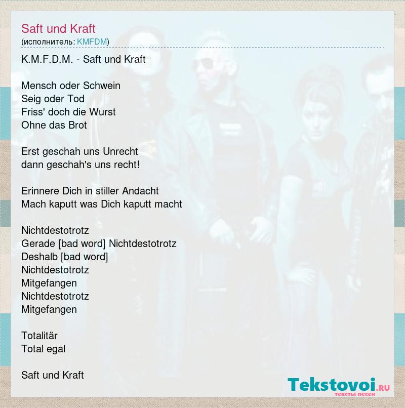 K.M.F.D.M. - Saft und Kraft Mensch oder Schwein Seig oder Tod Friss' doch die Wurst Ohne das Brot Erst geschah uns Unrecht dann geschah's uns recht! Erinnere Dich in stiller Andacht Mach kaputt was Dich kaputt macht Nichtdestotrotz Gerade drum Nichtdestotrotz Deshalb darum Nichtdestotrotz Mitgefangen Nichtdestotrotz Mitgefangen Totalitär Total egal Saft und Kraft