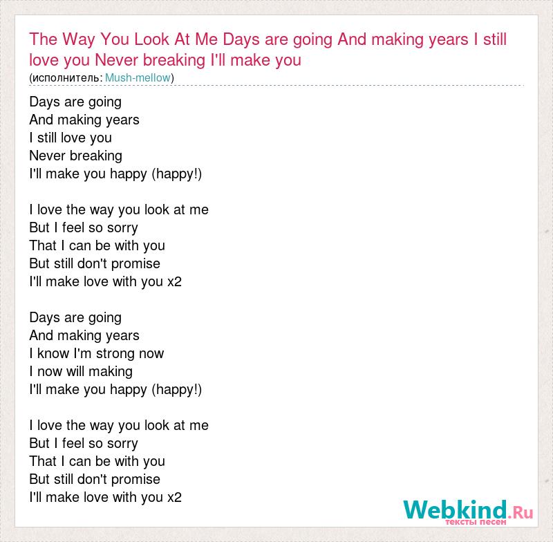 Days are going And making years I still love you Never breaking I'll make you happy (happy!) I love the way you look at me But I feel so sorry That I can be with you But still don't promise I'll make love with you x2 Days are going And making years I know I'm strong now I now will making I'll make you happy (happy!) I love the way you look at me But I feel so sorry That I can be with you But still don't promise I'll make love with you x2