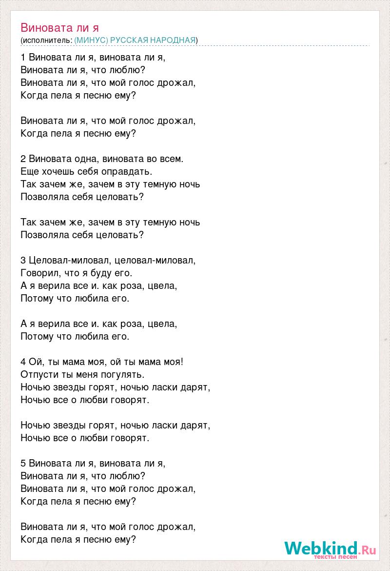 1 Виновата ли я, виновата ли я, Виновата ли я, что люблю? Виновата ли я, что мой голос дрожал, Когда пела я песню ему? Виновата ли я, что мой голос дрожал, Когда пела я песню ему? 2 Виновата одна, виновата во всем. Еще хочешь себя оправдать. Так зачем же, зачем в эту темную ночь Позволяла себя целовать? Так зачем же, зачем в эту темную ночь Позволяла себя целовать? 3 Целовал-миловал, целовал-миловал, Говорил, что я буду его. А я верила все и. как роза, цвела, Потому что любила его. А я верила все и. как роза, цвела, Потому что любила его. 4 Ой, ты мама моя, ой ты мама моя! Отпусти ты меня погулять. Ночью звезды горят, ночью ласки дарят, Ночью все о любви говорят. Ночью звезды горят, ночью ласки дарят, Ночью все о любви говорят. 5 Виновата ли я, виновата ли я, Виновата ли я, что люблю? Виновата ли я, что мой голос дрожал, Когда пела я песню ему? Виновата ли я, что мой голос дрожал, Когда пела я песню ему?
