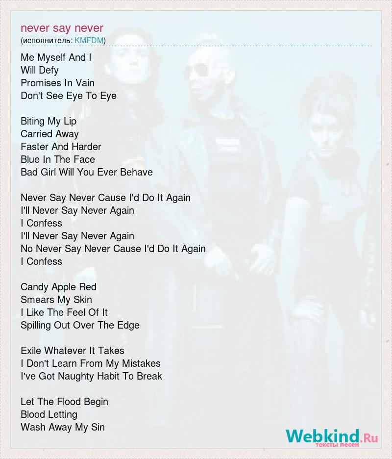 Me Myself And I Will Defy Promises In Vain Don't See Eye To Eye Biting My Lip Carried Away Faster And Harder Blue In The Face Bad Girl Will You Ever Behave Never Say Never Cause I'd Do It Again I'll Never Say Never Again I Confess I'll Never Say Never Again No Never Say Never Cause I'd Do It Again I Confess Candy Apple Red Smears My Skin I Like The Feel Of It Spilling Out Over The Edge Exile Whatever It Takes I Don't Learn From My Mistakes I've Got Naughty Habit To Break Let The Flood Begin Blood Letting Wash Away My Sin